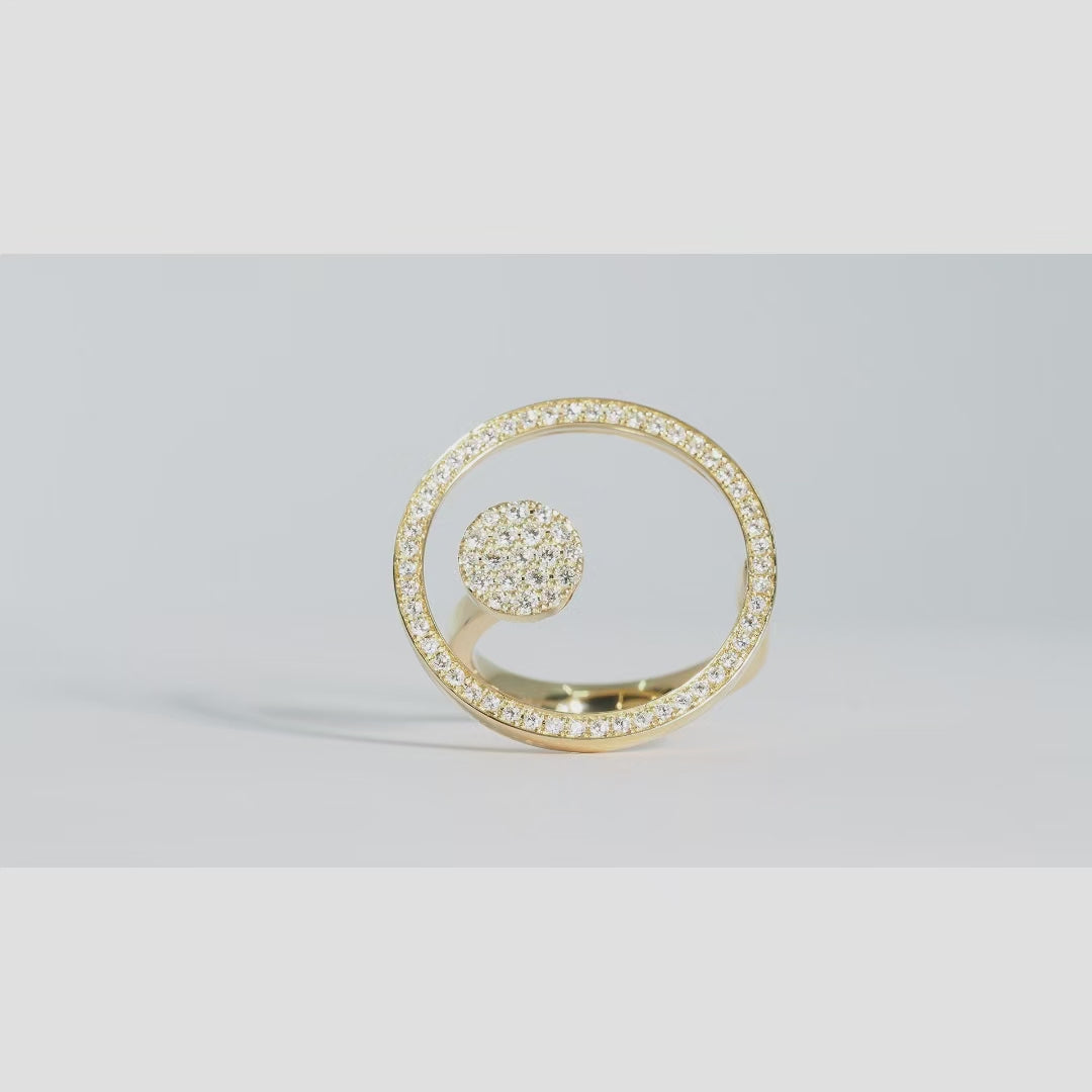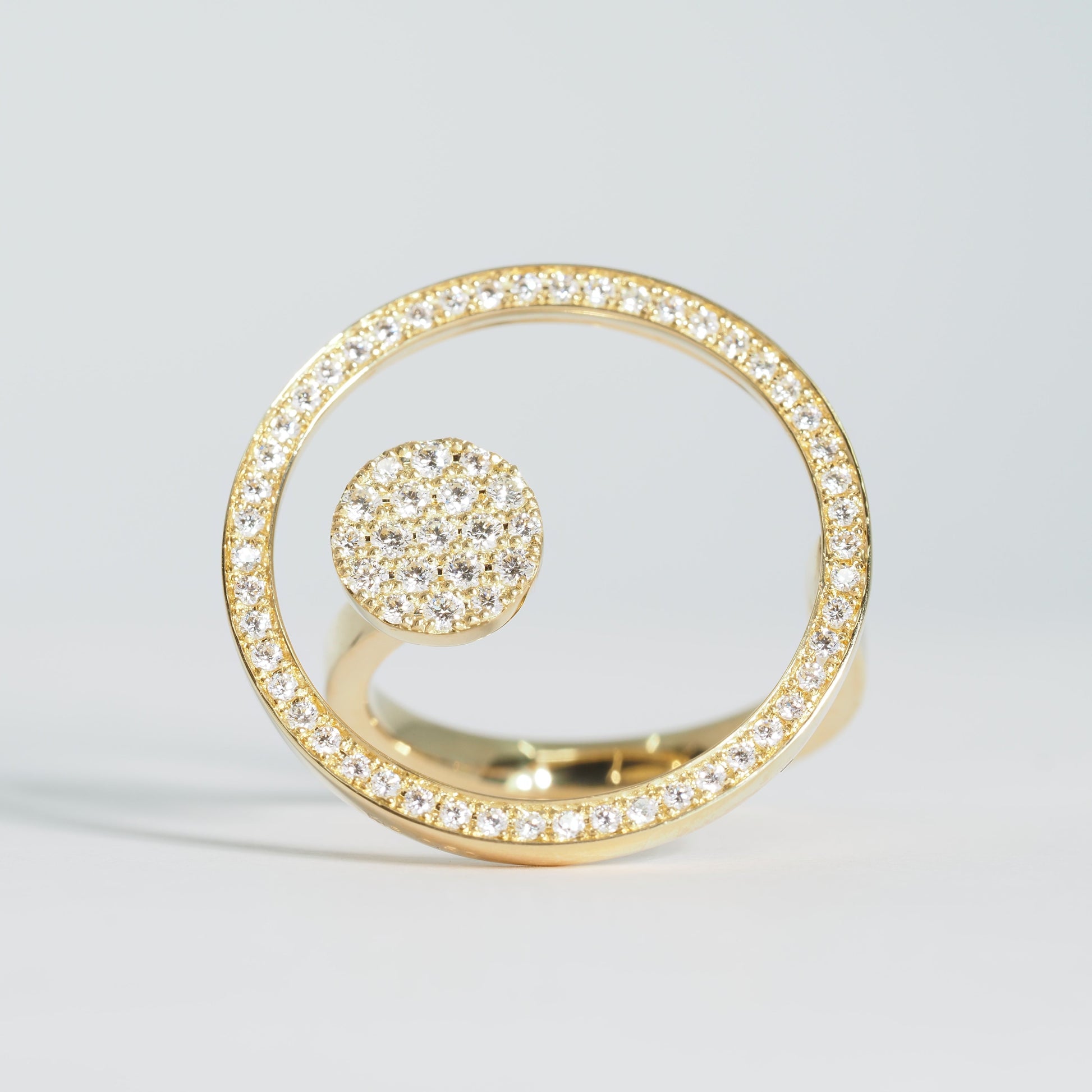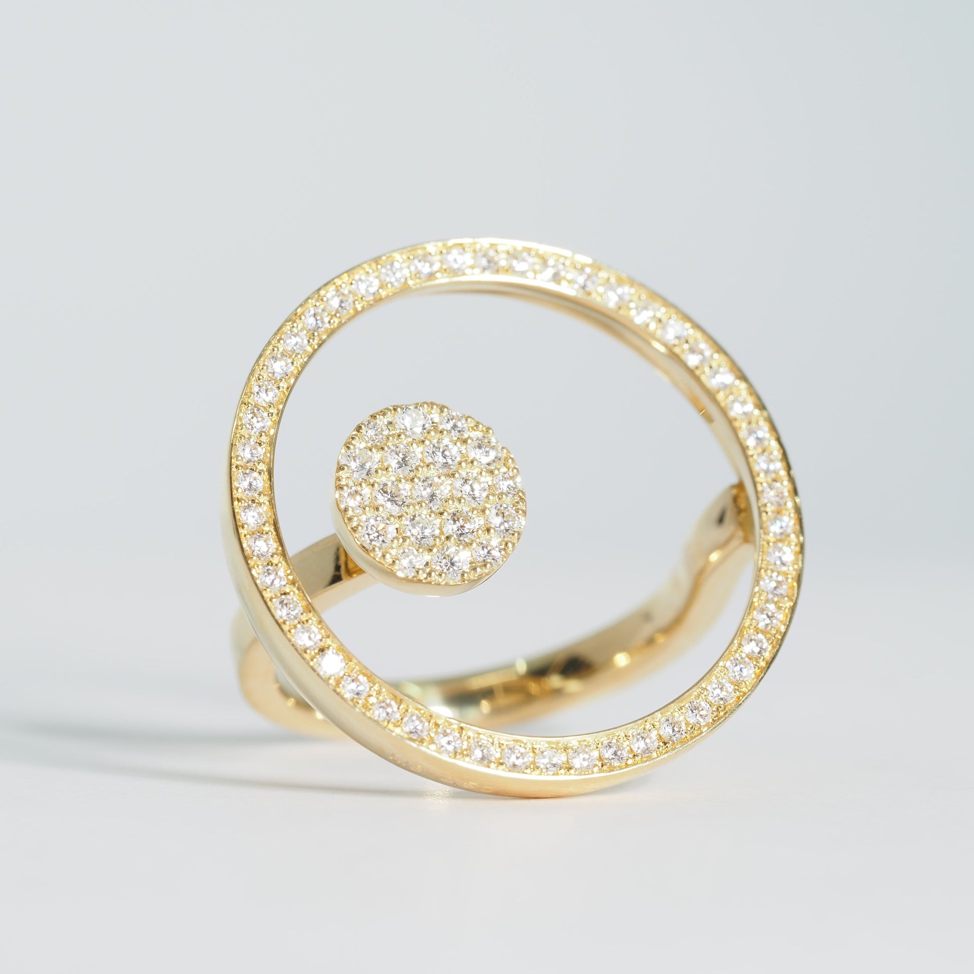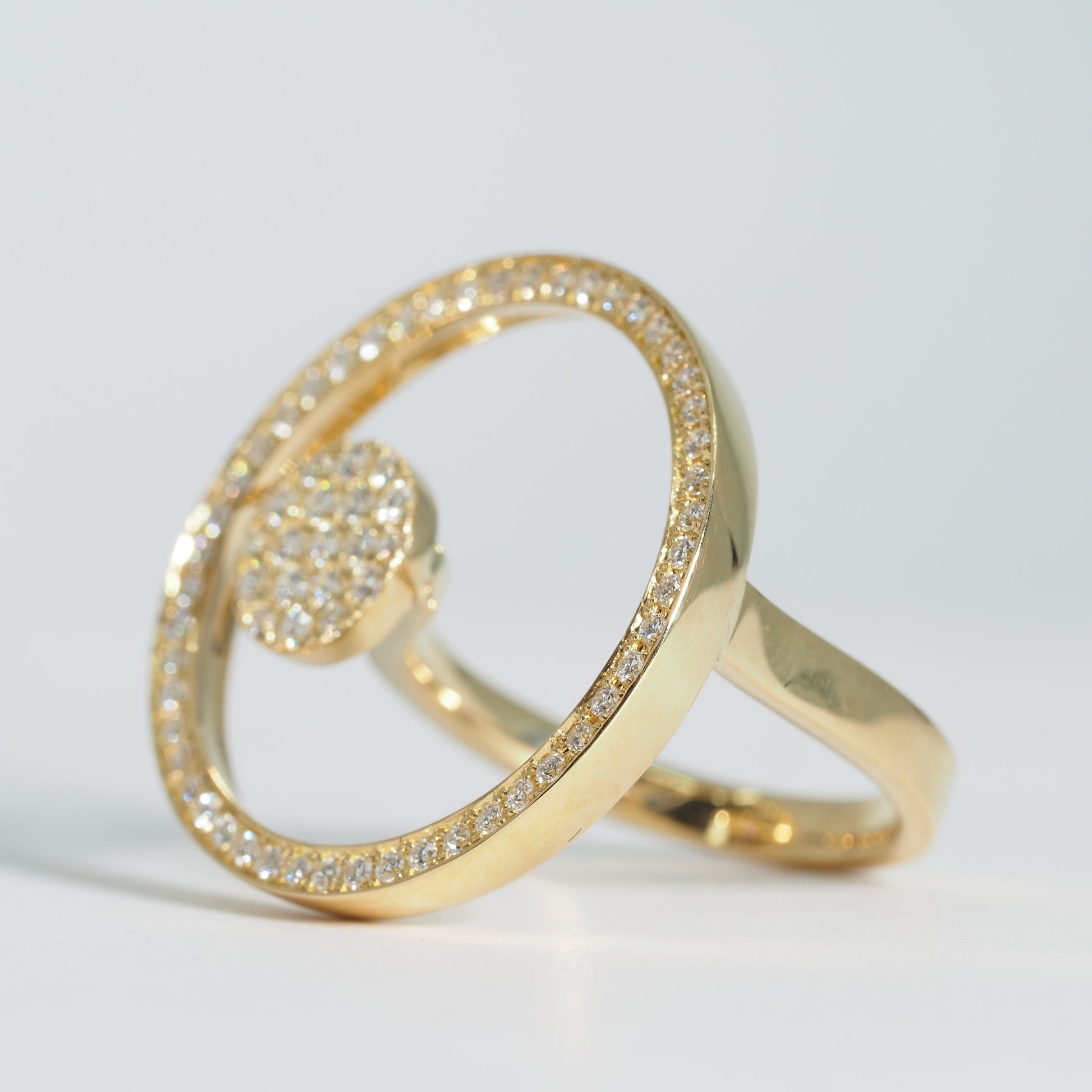 円を描くようにセッティングされたダイヤモンドが光を受けて連続的に煌めき、洗練された存在感を放ちます。