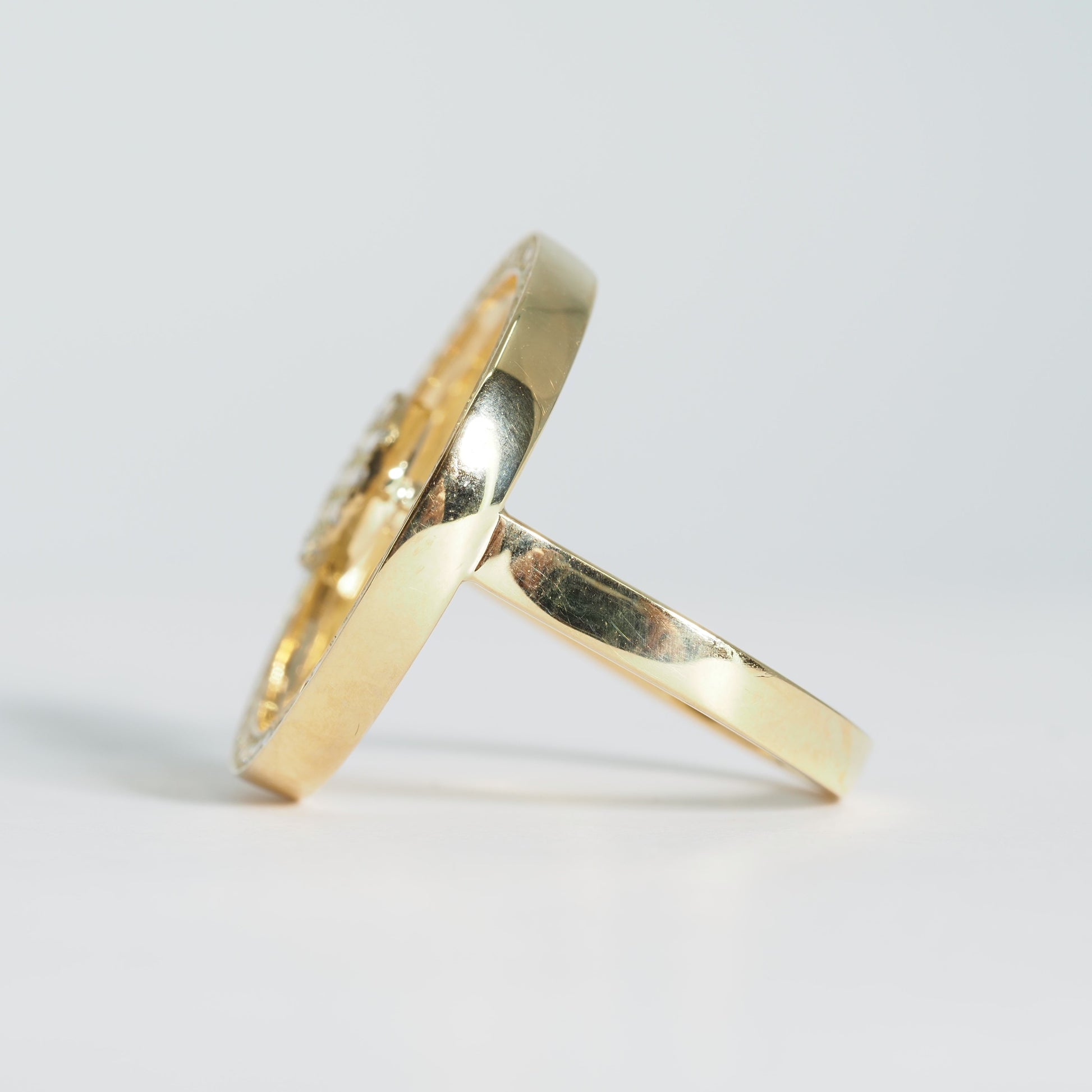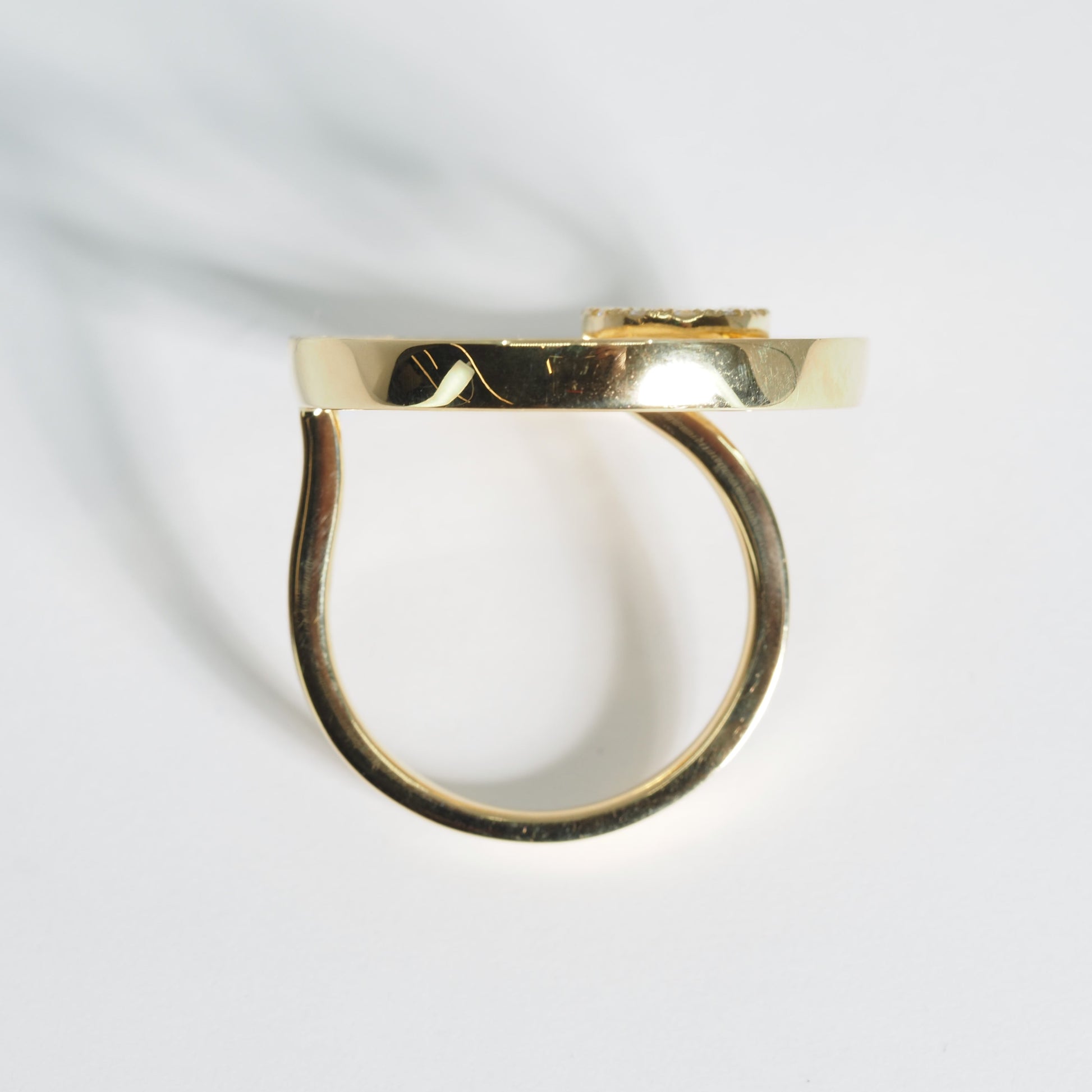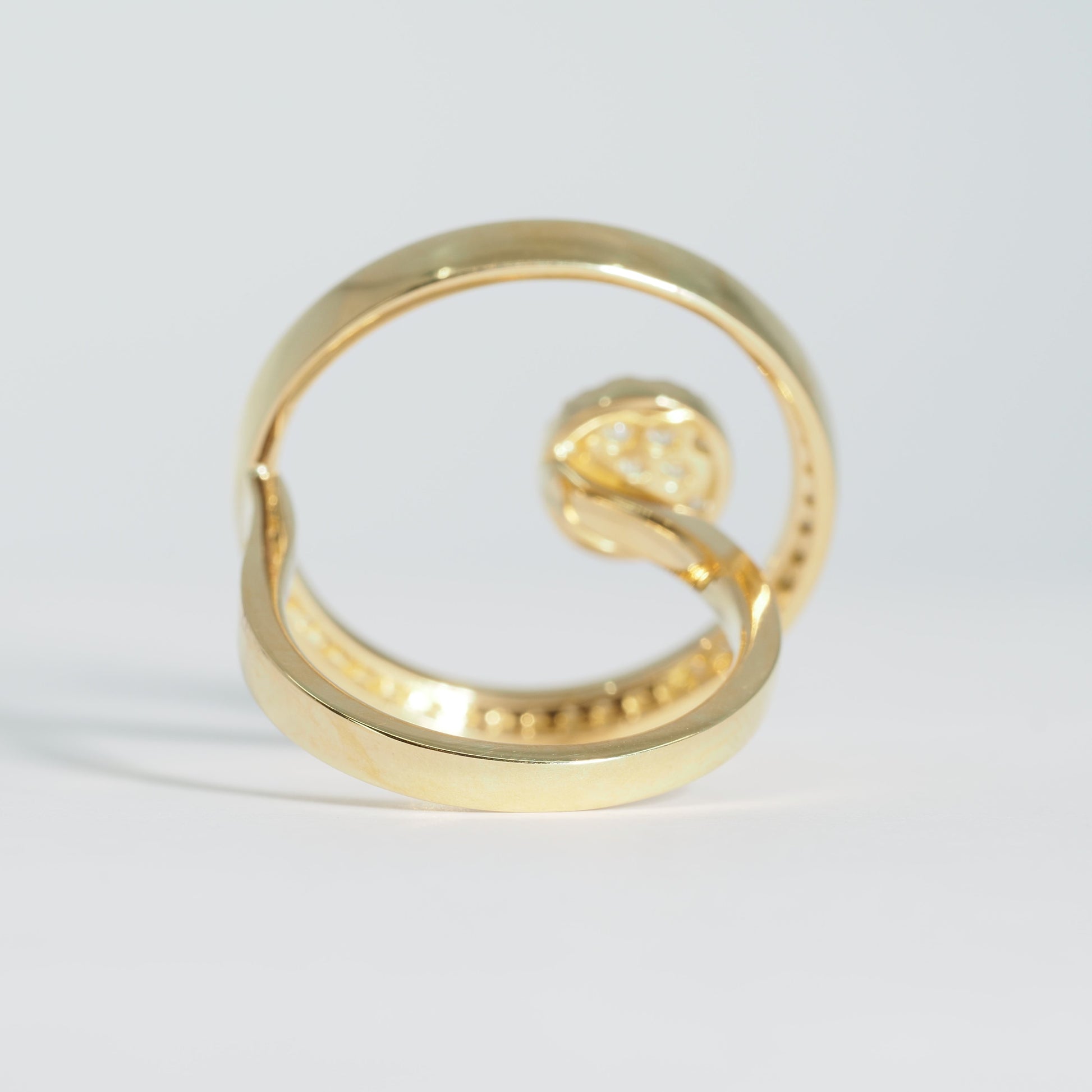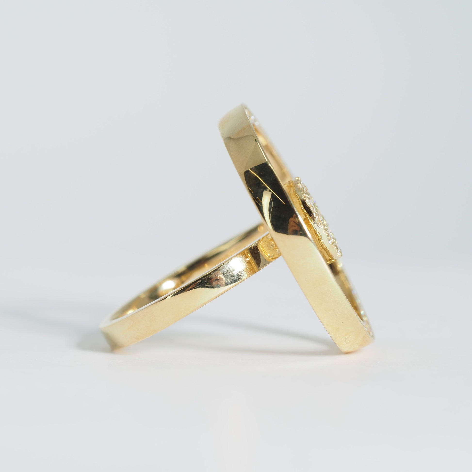 K18の艶やかな輝きに、贅沢にあしらわれたダイヤモンドが美しく映えるデザインリング。