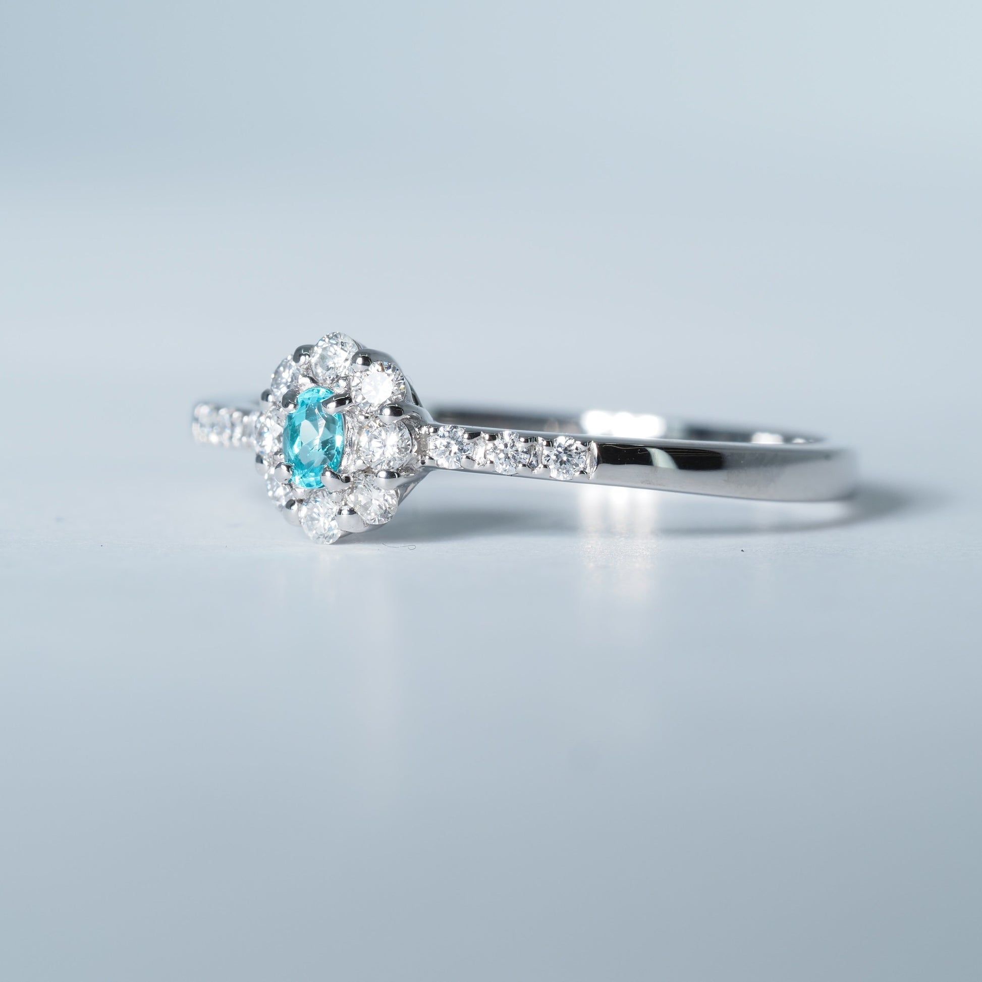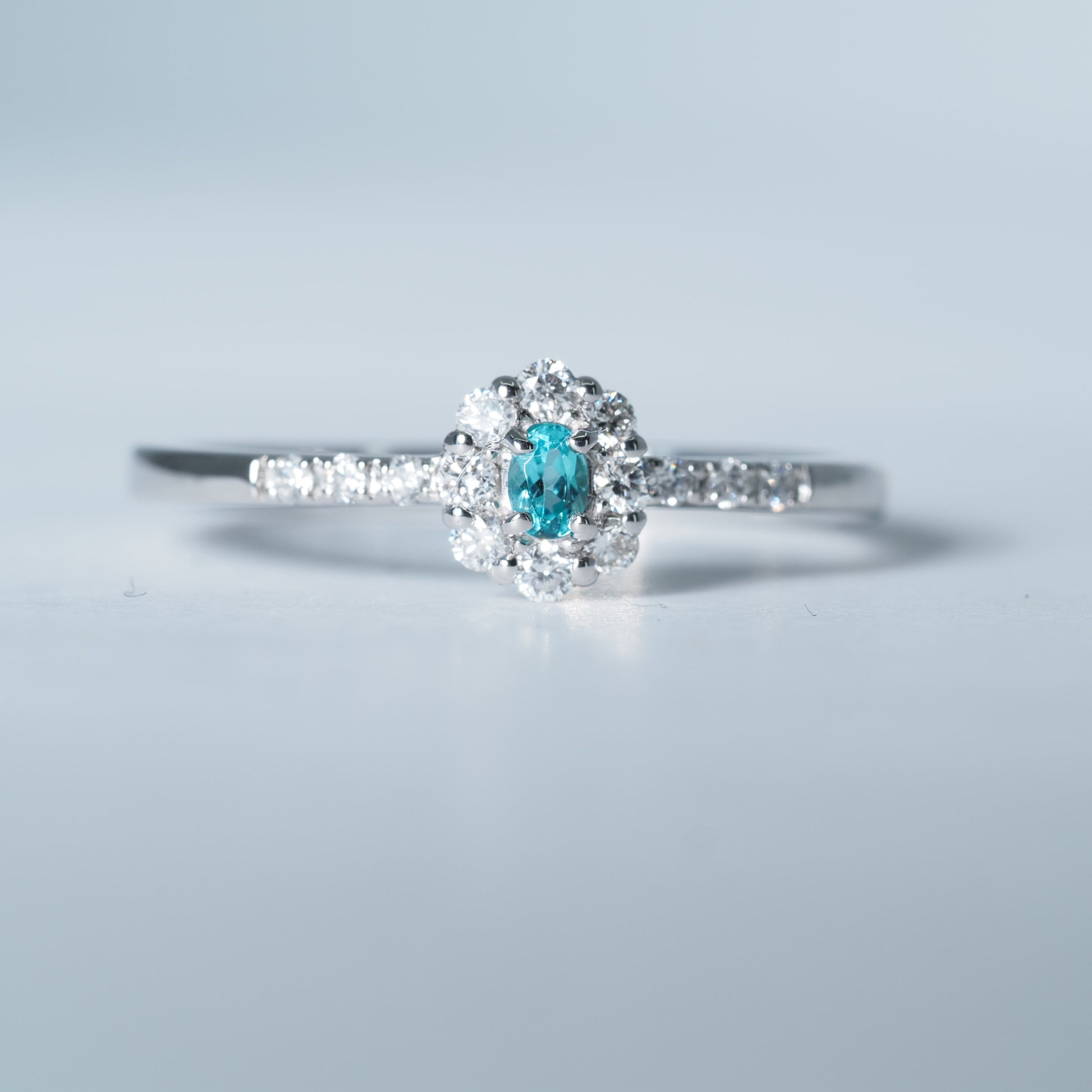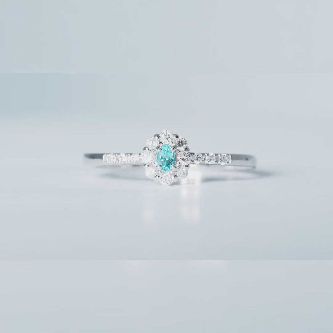 鮮やかなネオンブルーのパライバトルマリンを、上質なダイヤモンドが取り囲むクラシカルなヘイローデザインが、宝石の輝きを一層引き立てます。