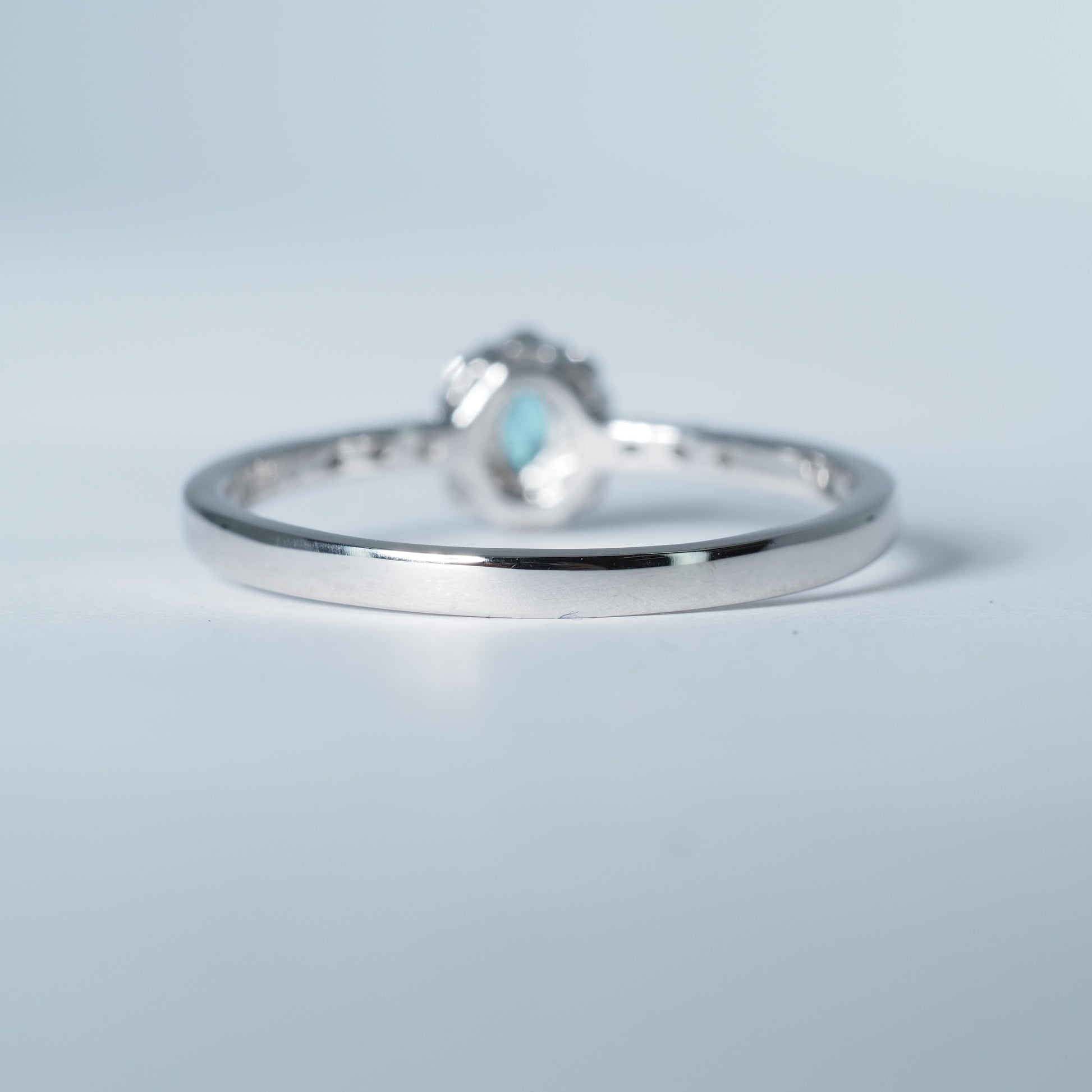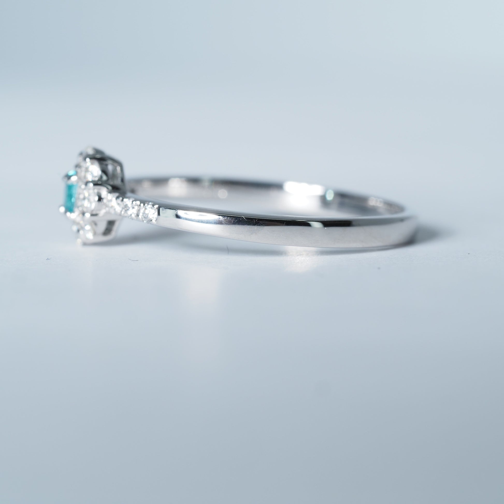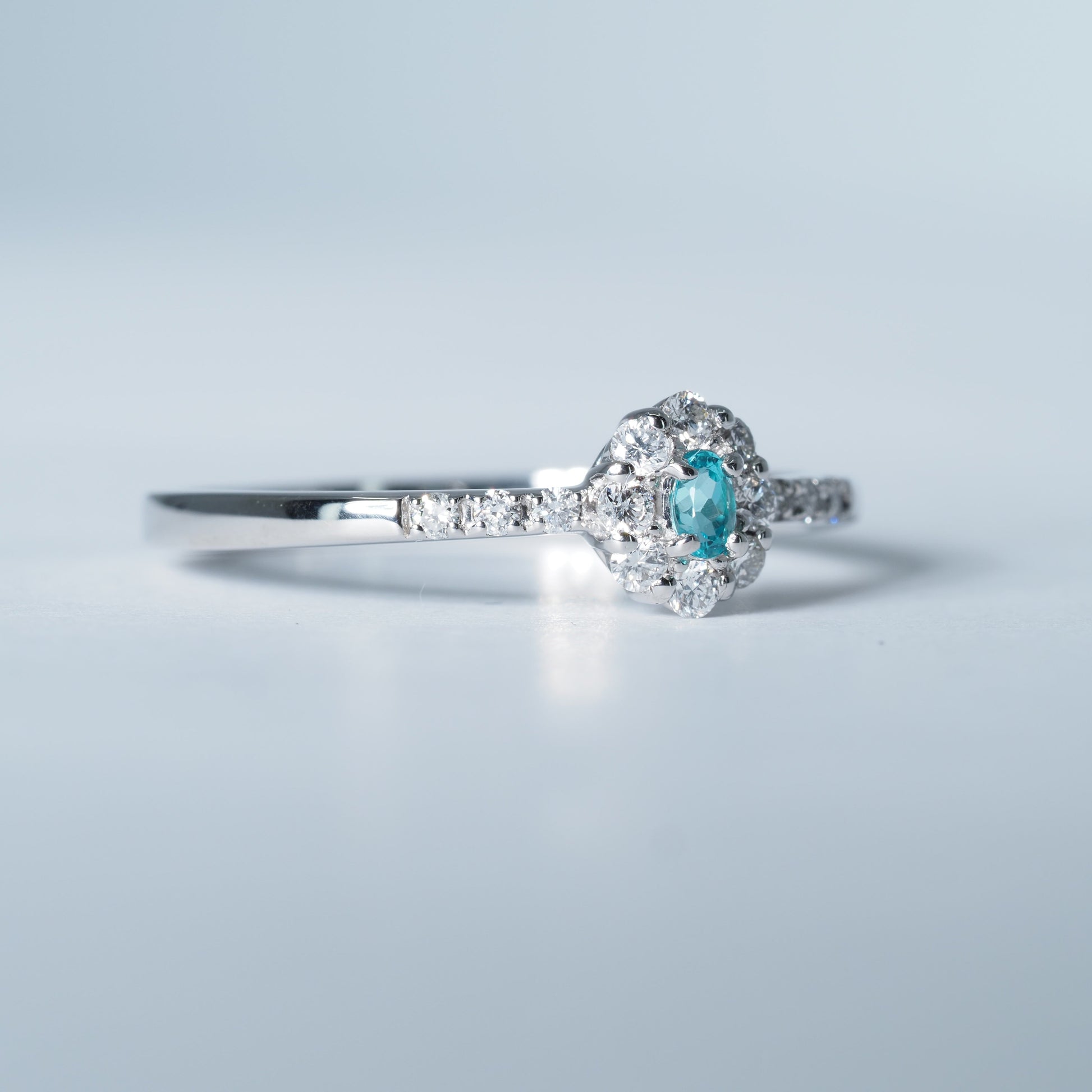 鮮やかなネオンブルーのパライバトルマリンを、上質なダイヤモンドが取り囲むクラシカルなヘイローデザインが、宝石の輝きを一層引き立てます。