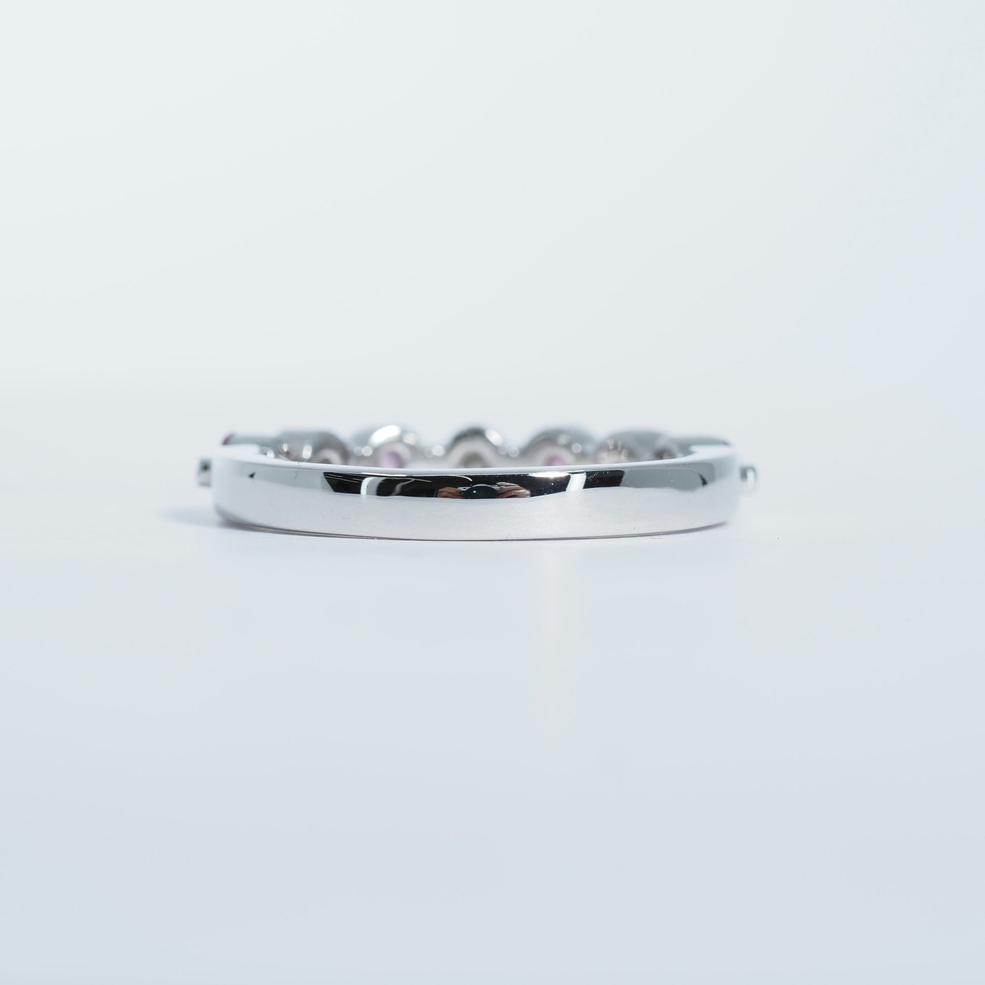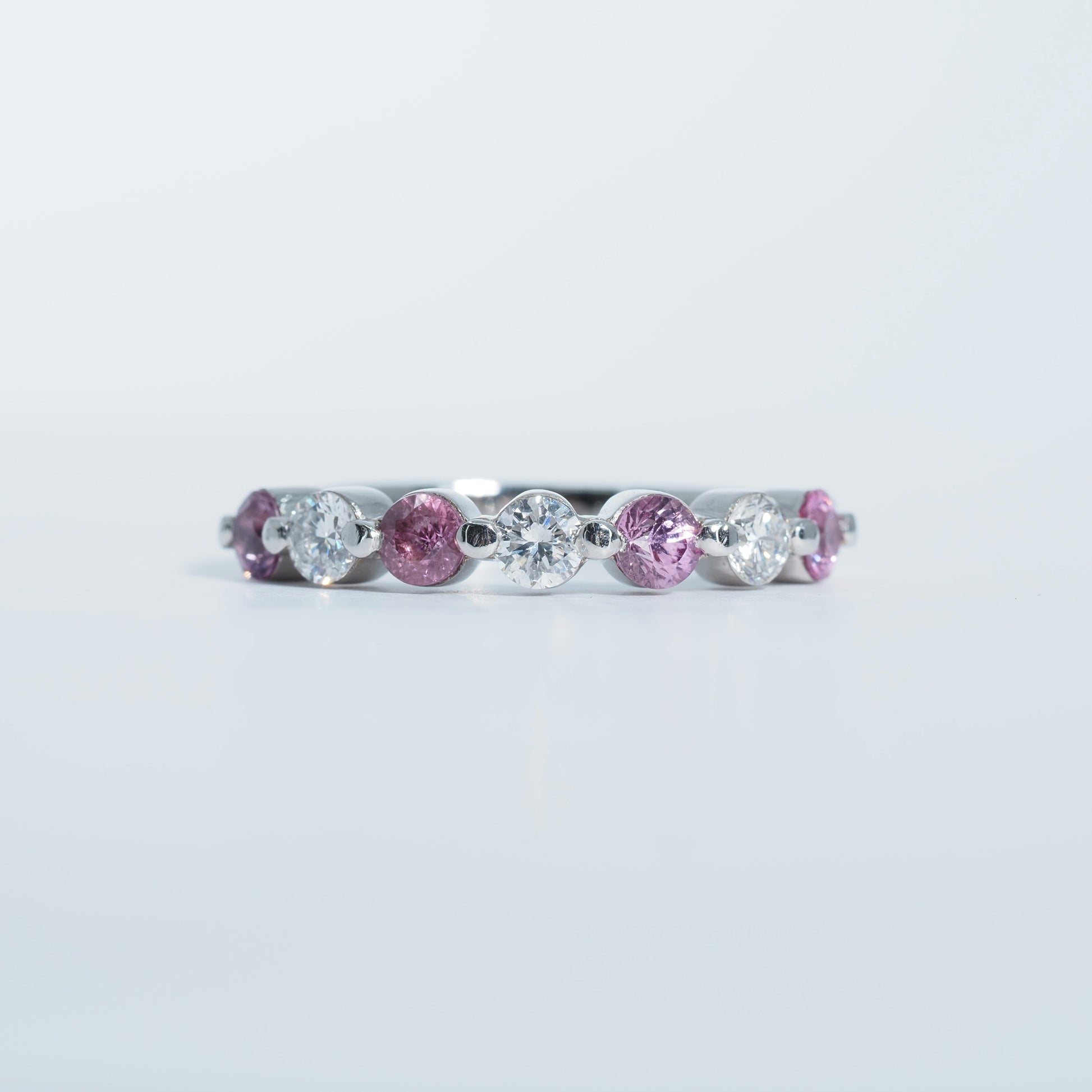 プラチナの落ち着いた輝きが宝石一粒一粒を引き立て、ダイヤモンドの透明感とピンクサファイアの色味を美しく調和しています。