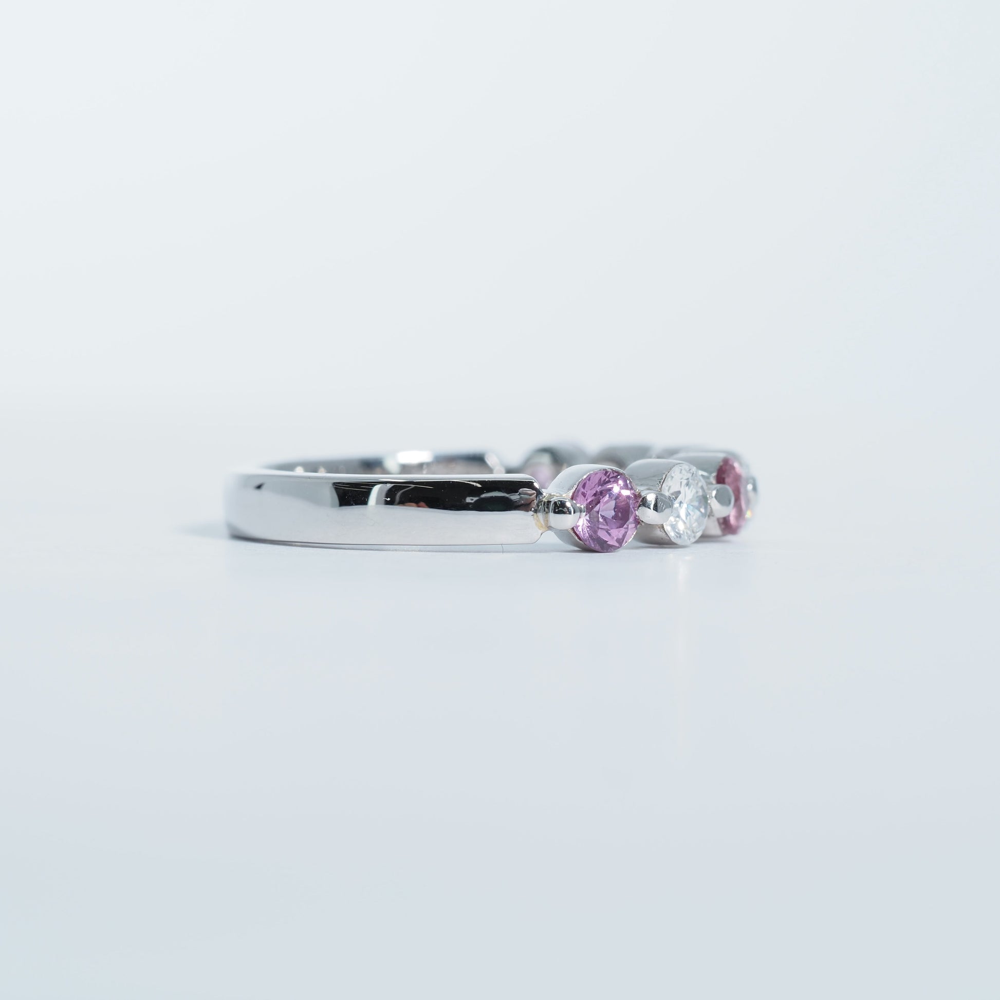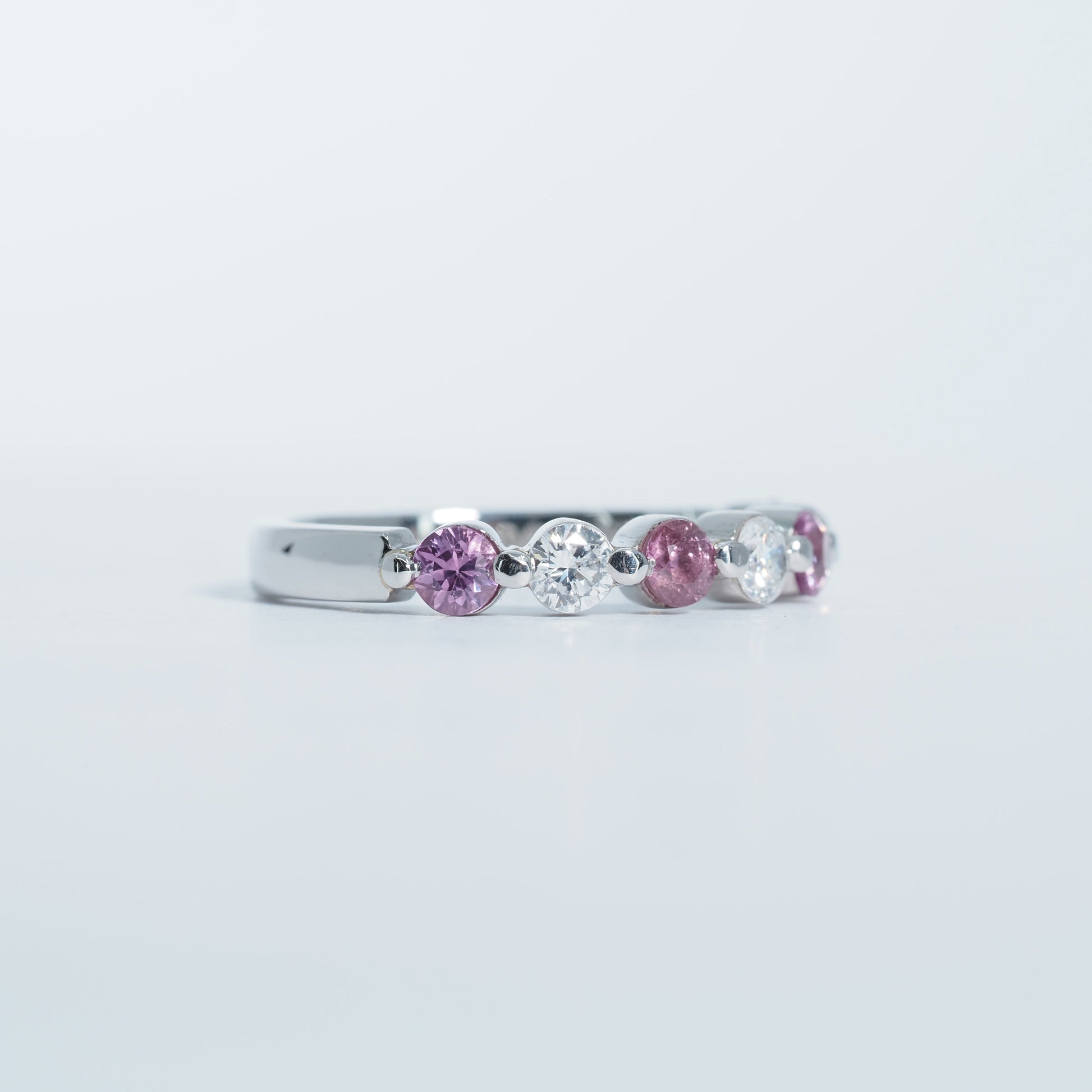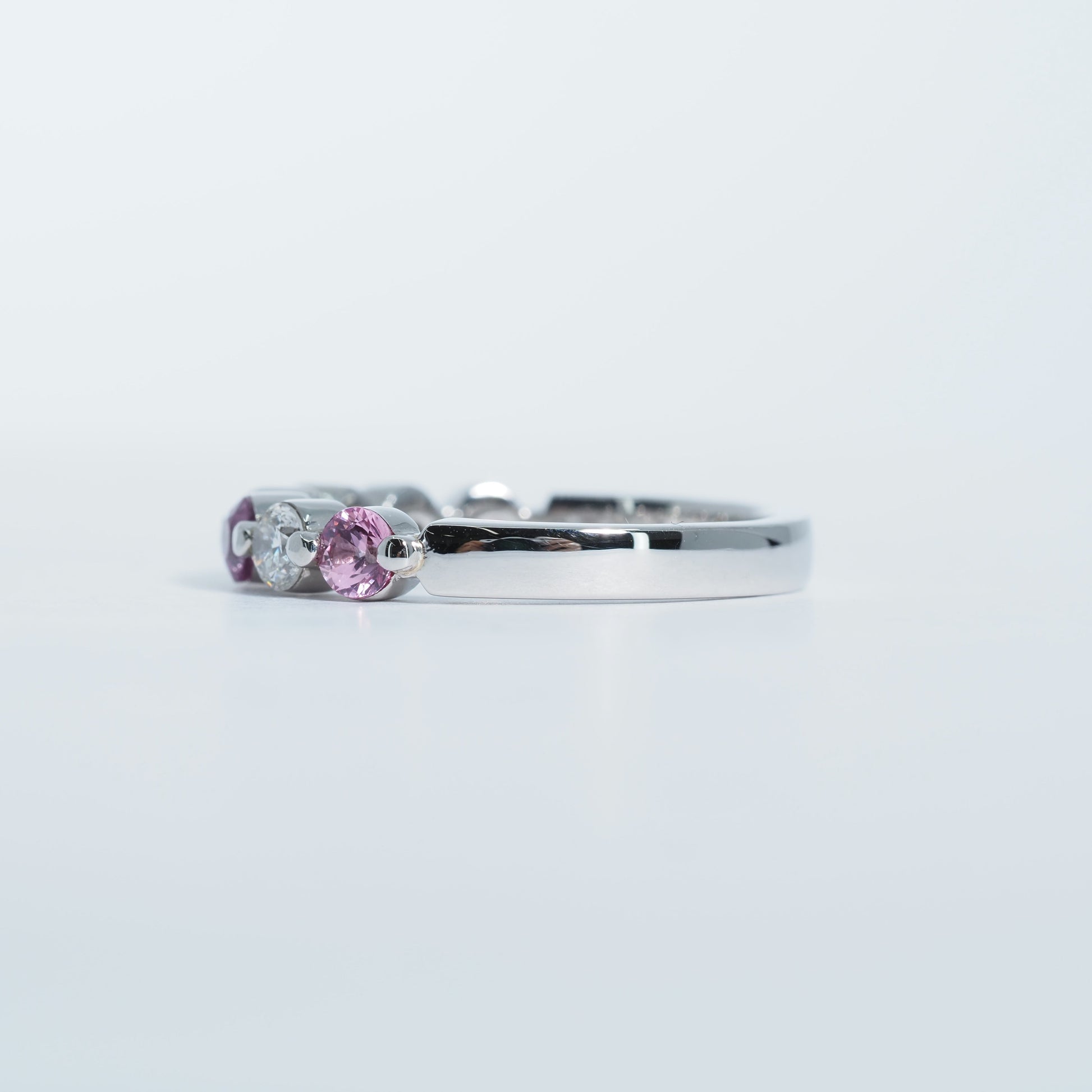 可憐なピンクサファイアと澄んだ輝きのダイヤモンドをリズミカルに配置したリング。