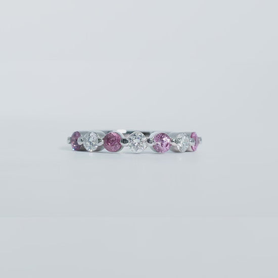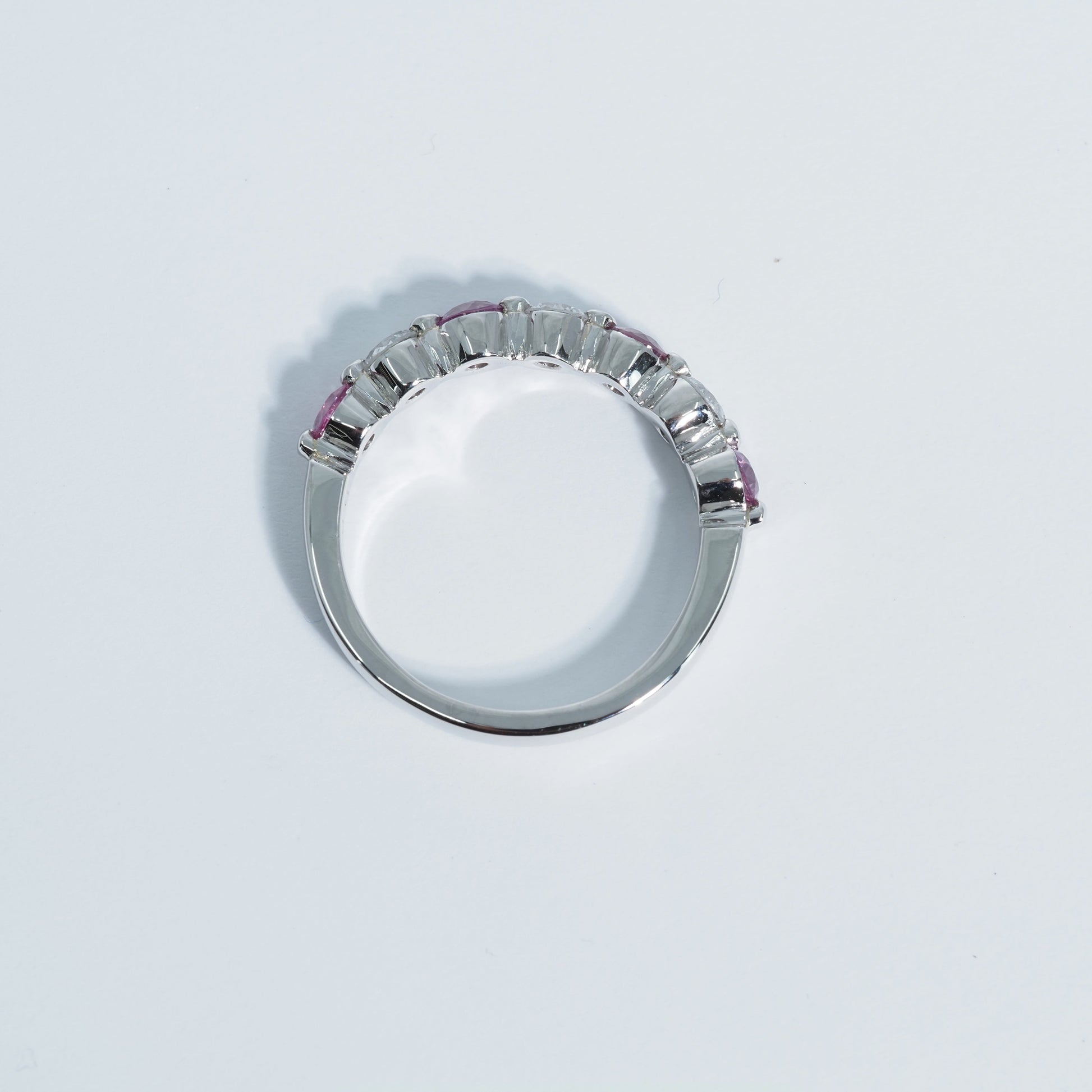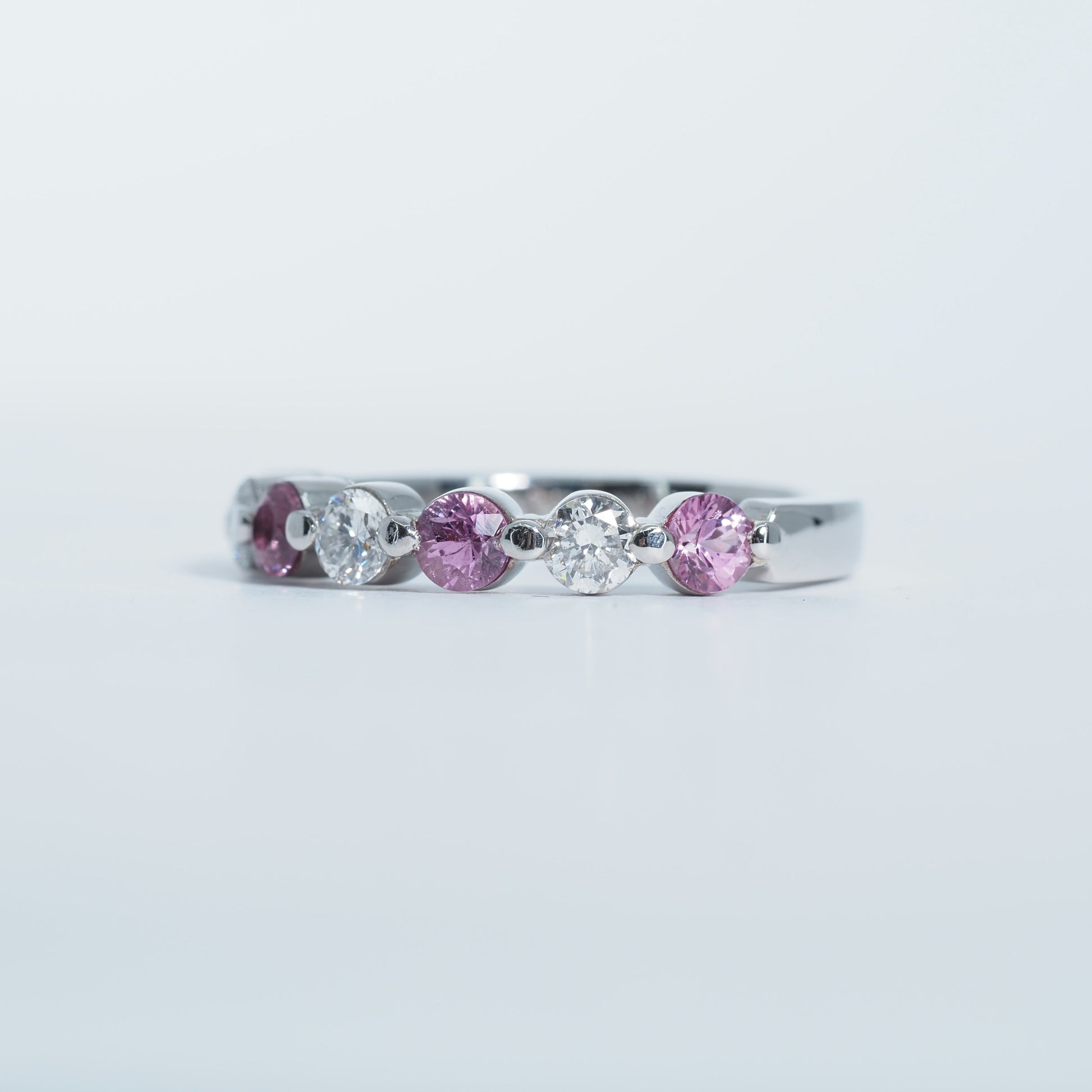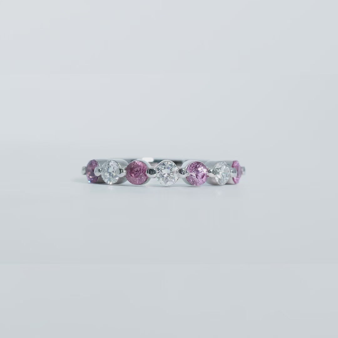 可憐なピンクサファイアと澄んだ輝きのダイヤモンドをリズミカルに配置したリング。