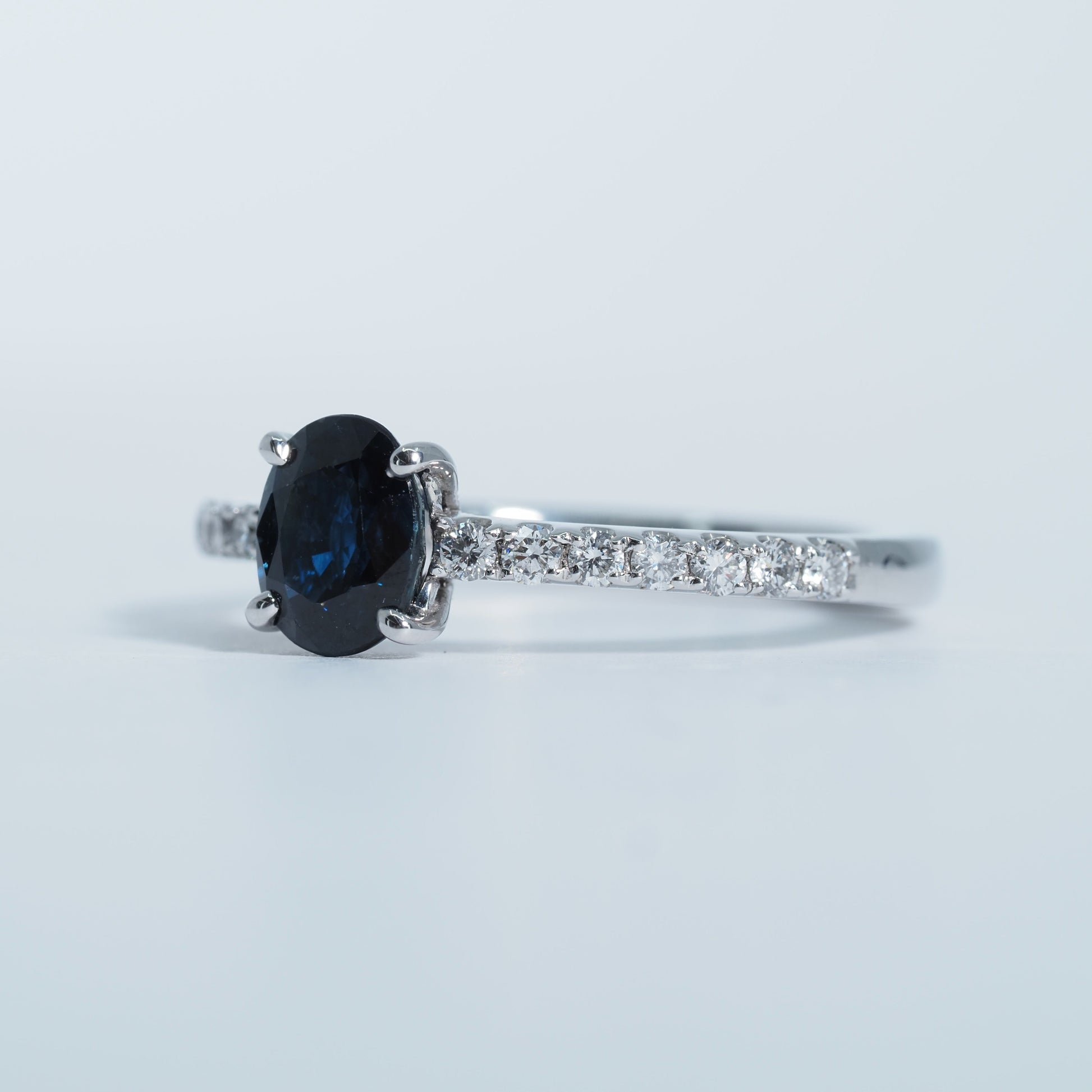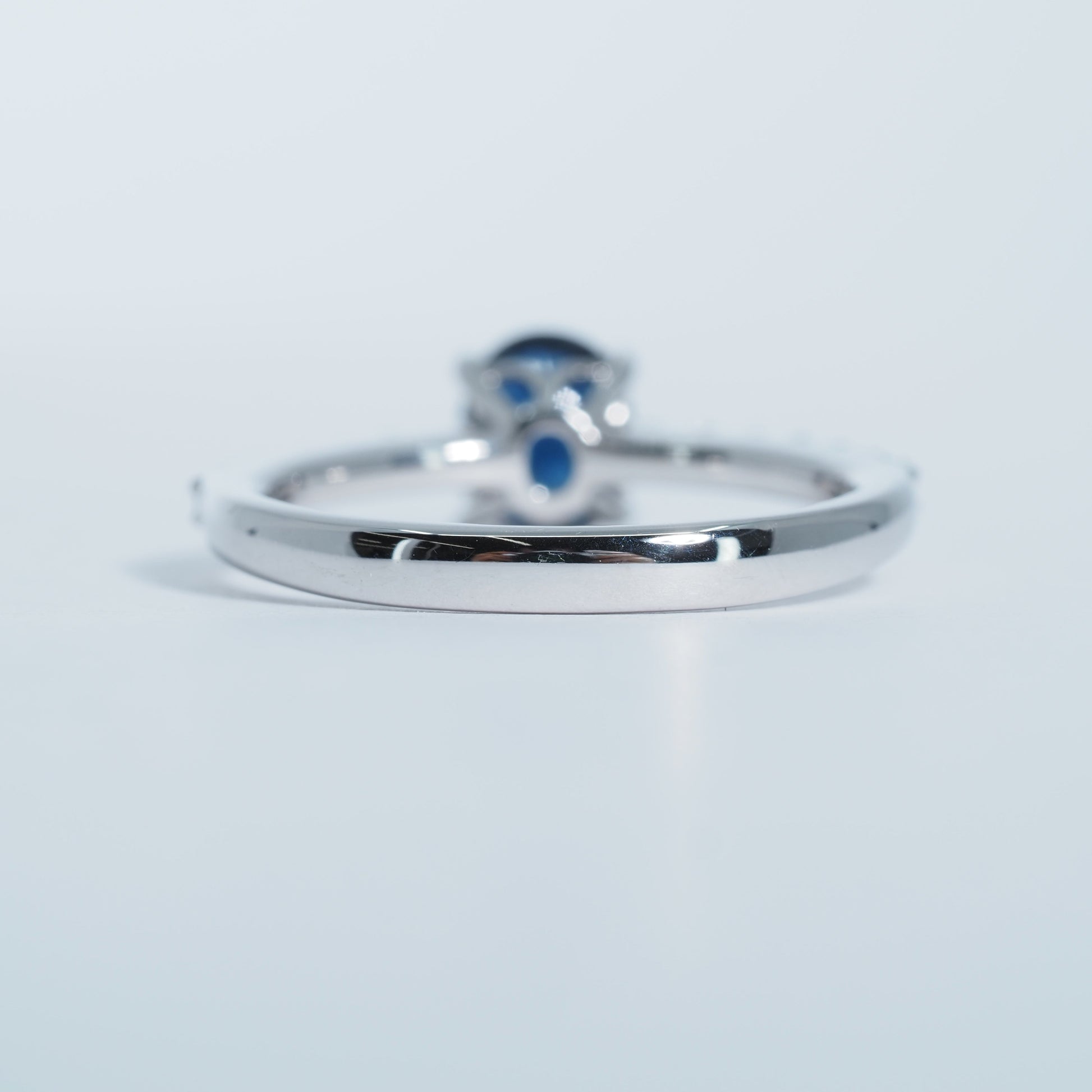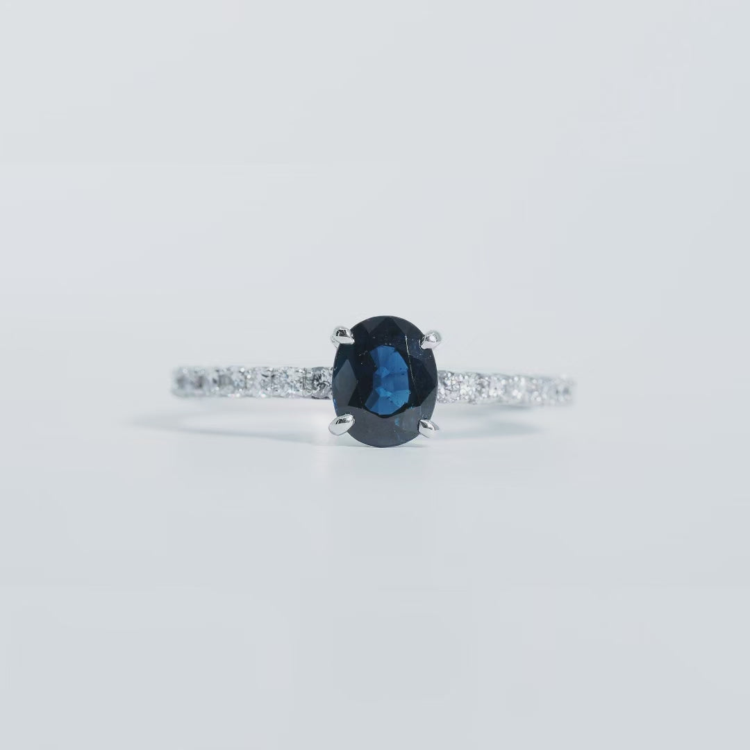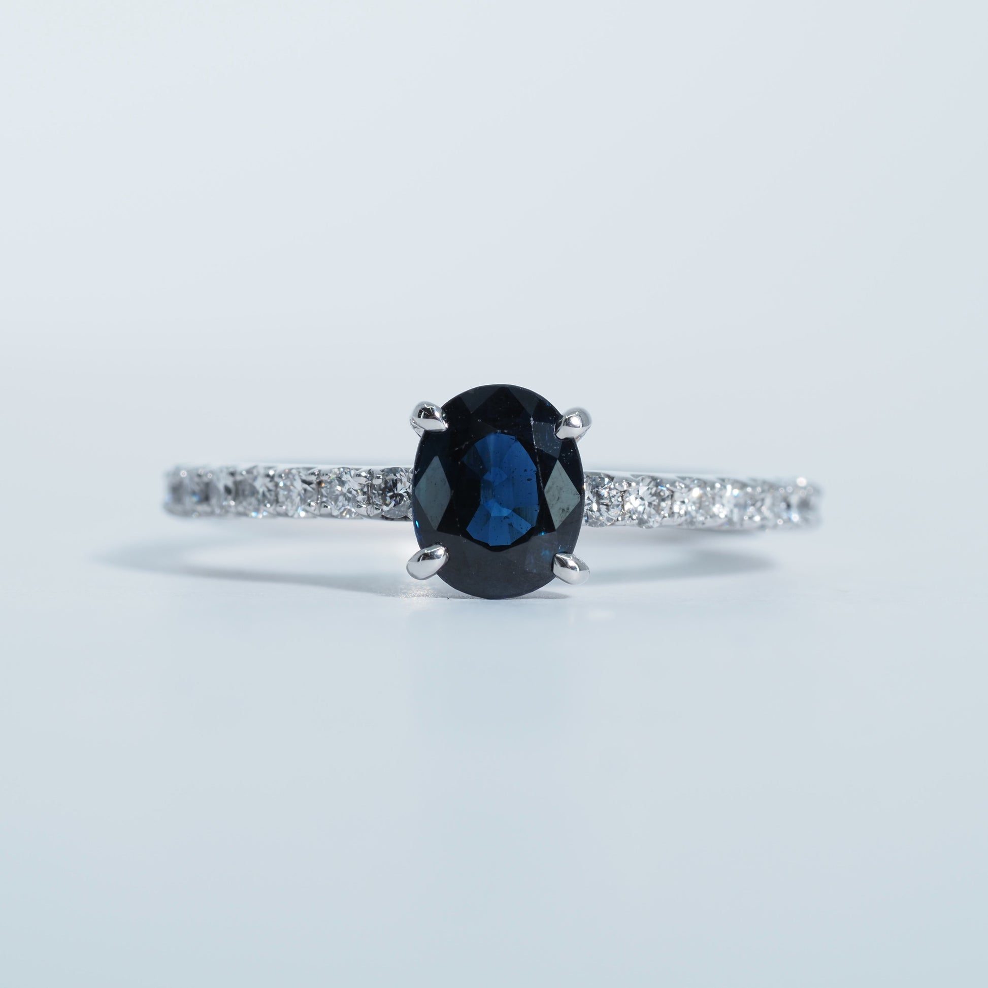 オーバルカットのサファイアは、光を受けるたびに奥行きのある輝きを放ち、落ち着きと気品を感じさせます。