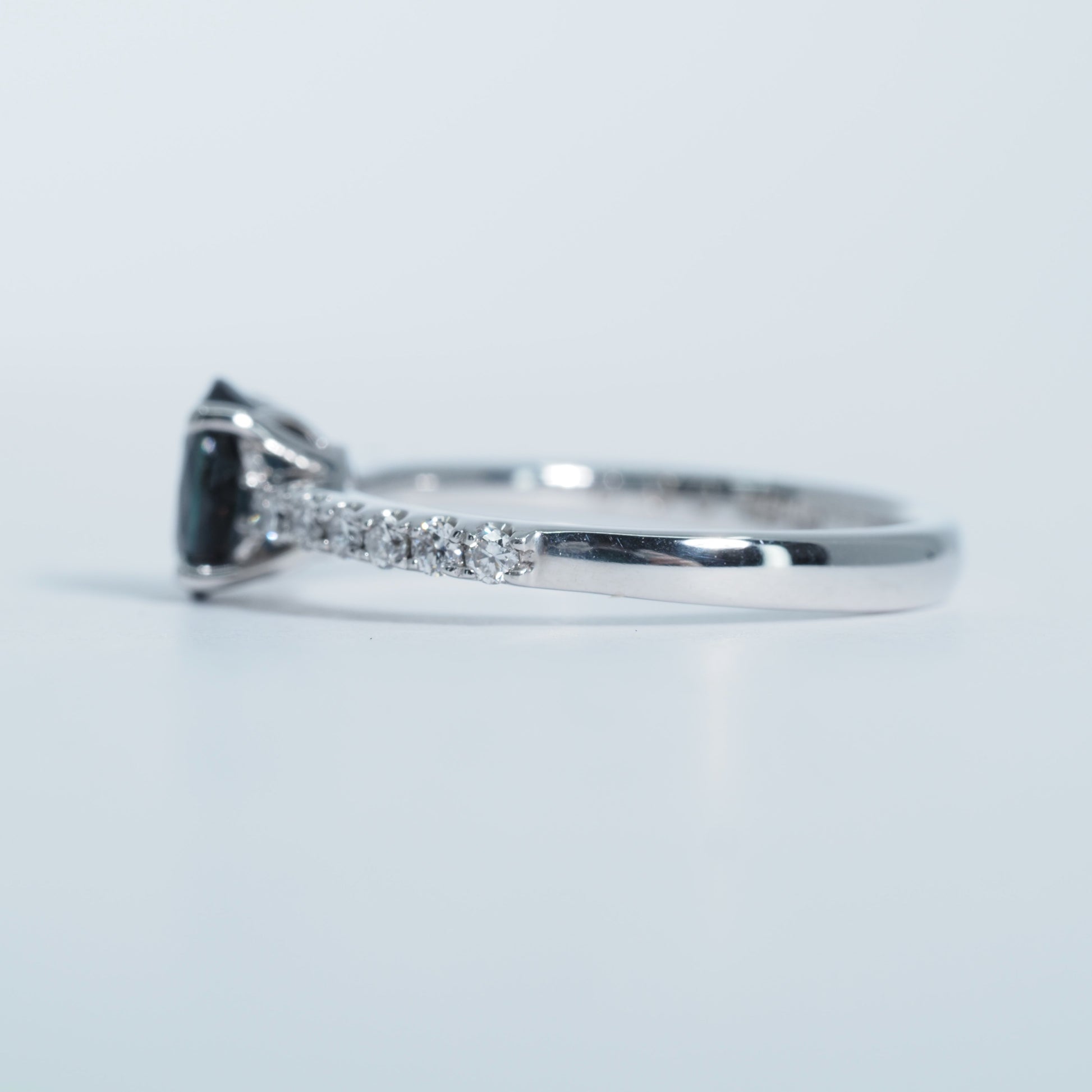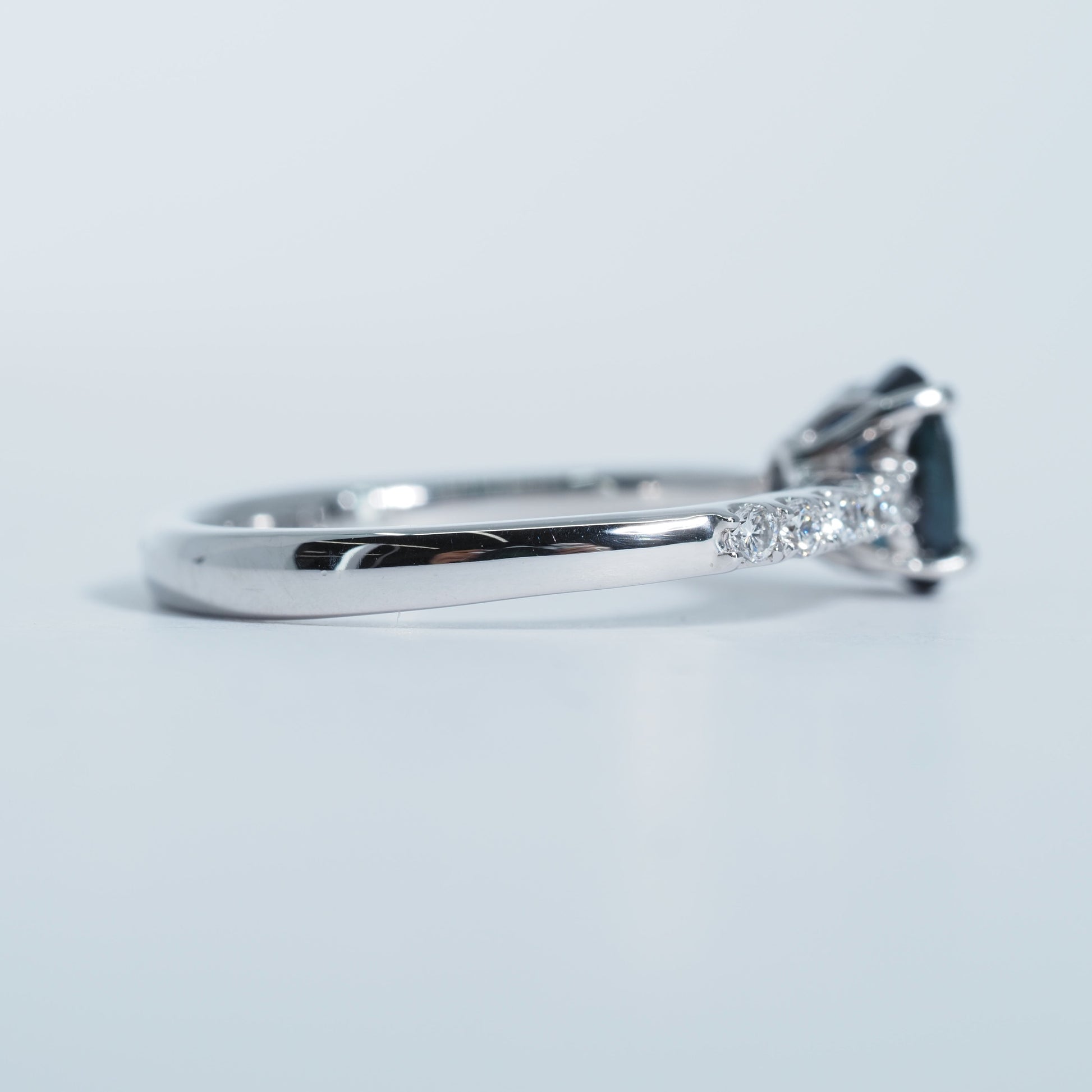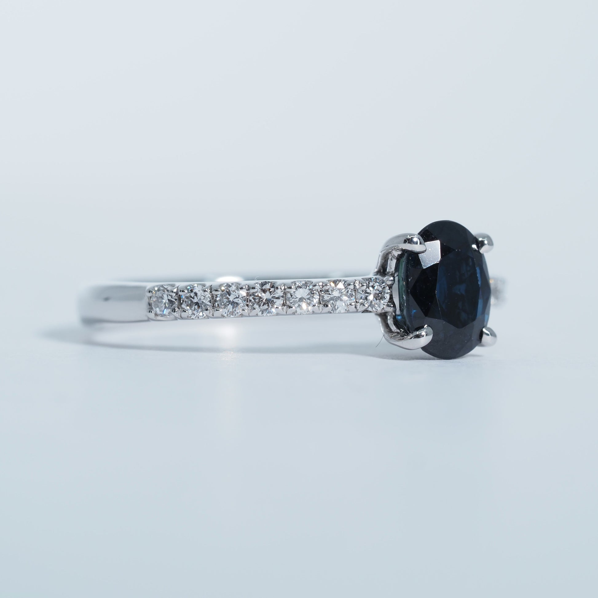 オーバルカットのサファイアは、光を受けるたびに奥行きのある輝きを放ち、落ち着きと気品を感じさせます。