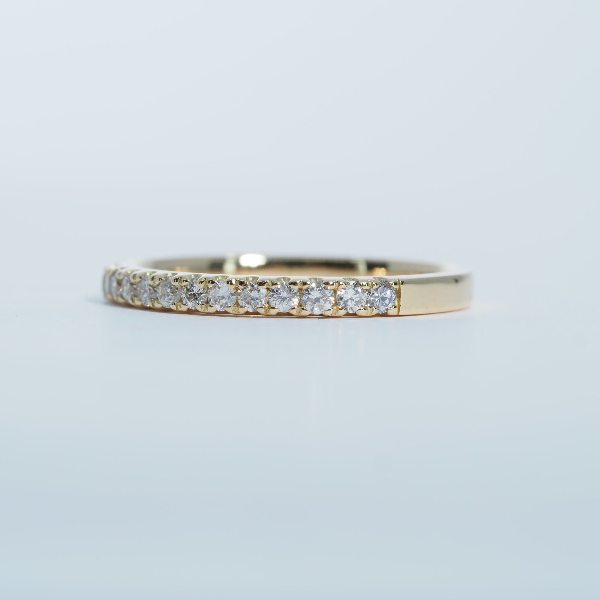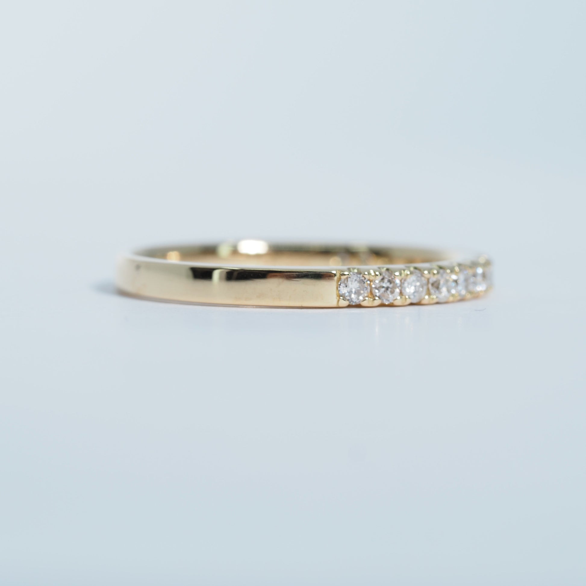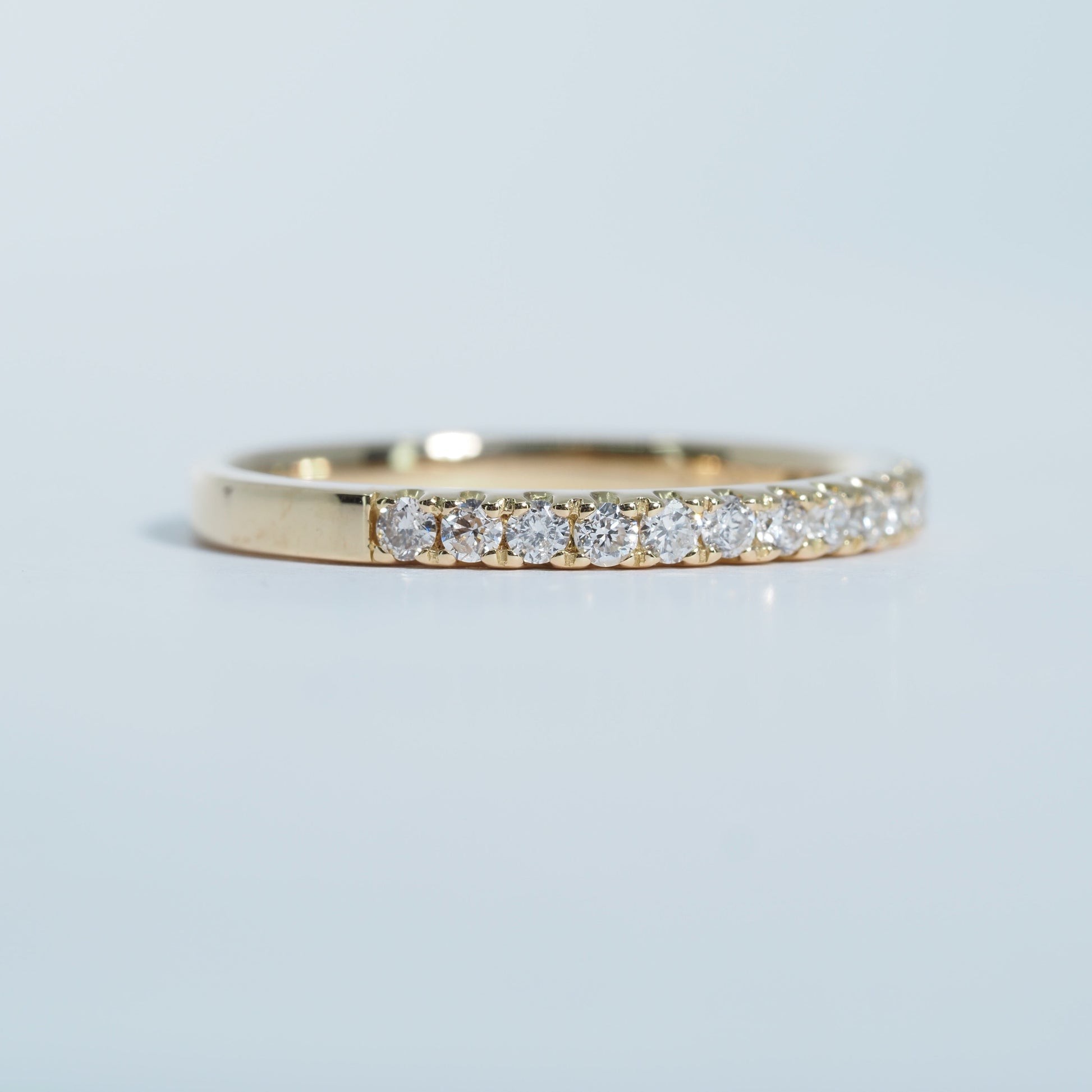 K18の美しいゴールドに、厳選されたダイヤモンドを連ねたハーフエタニティリング。