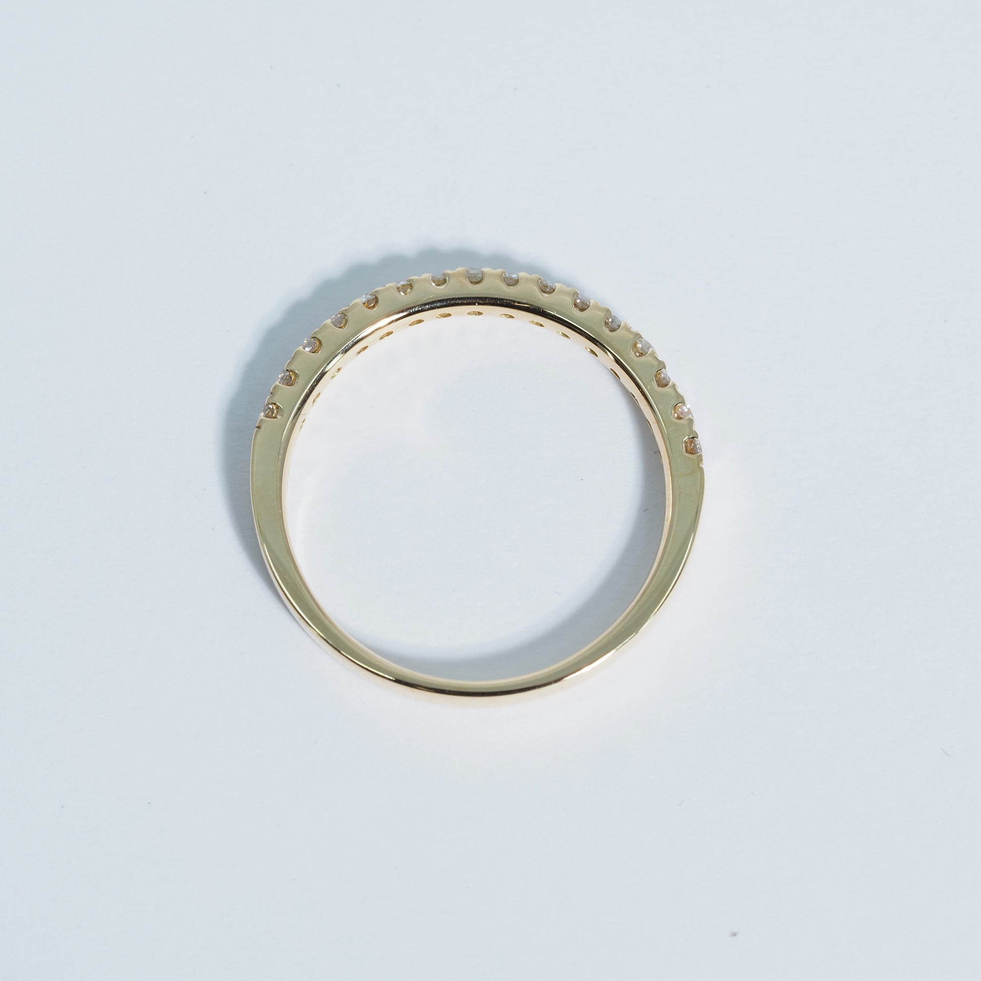 指の半周にわたりダイヤモンドをセッティングすることで、手元に程よい華やかさを添えながら、日常使いにも適した着け心地を実現しています。