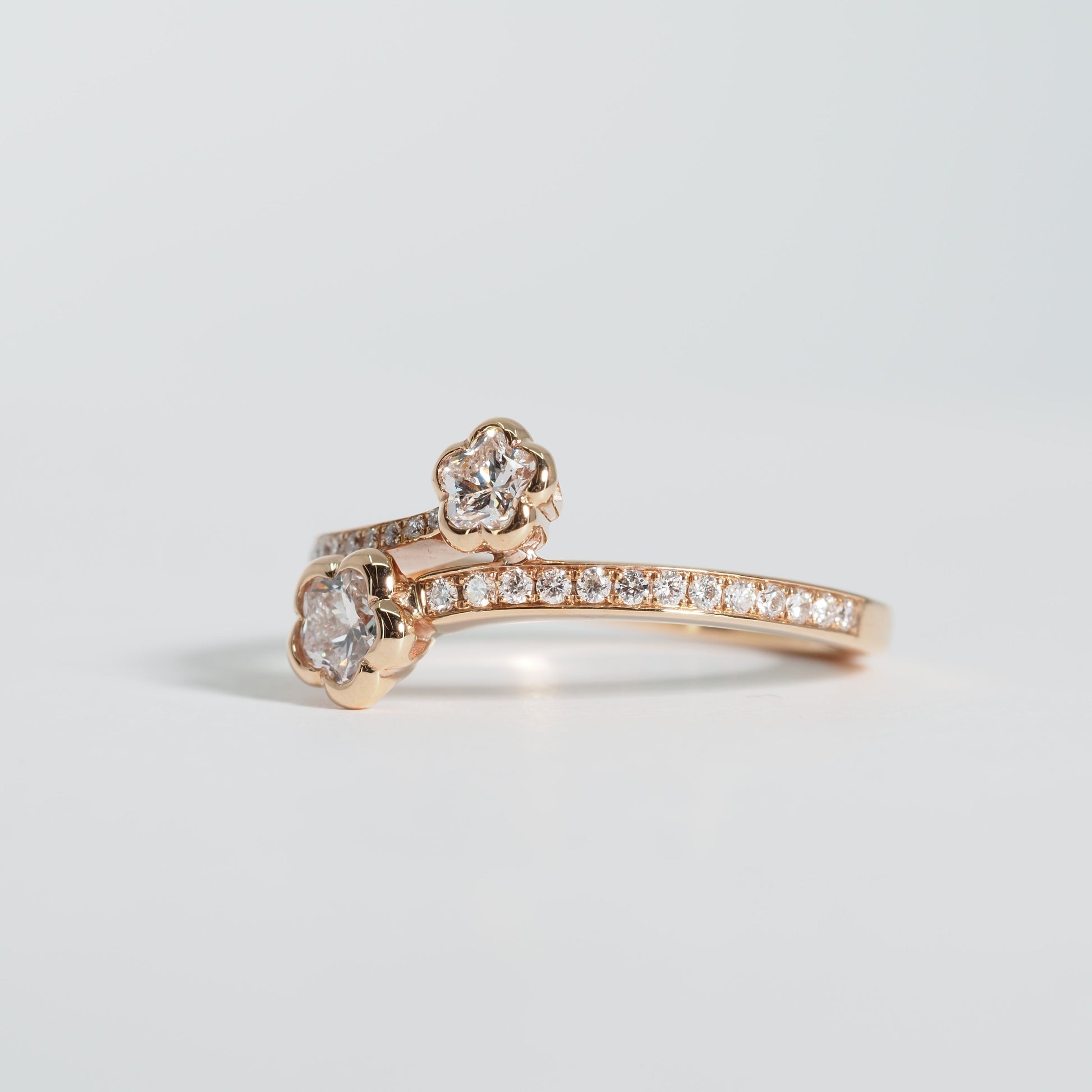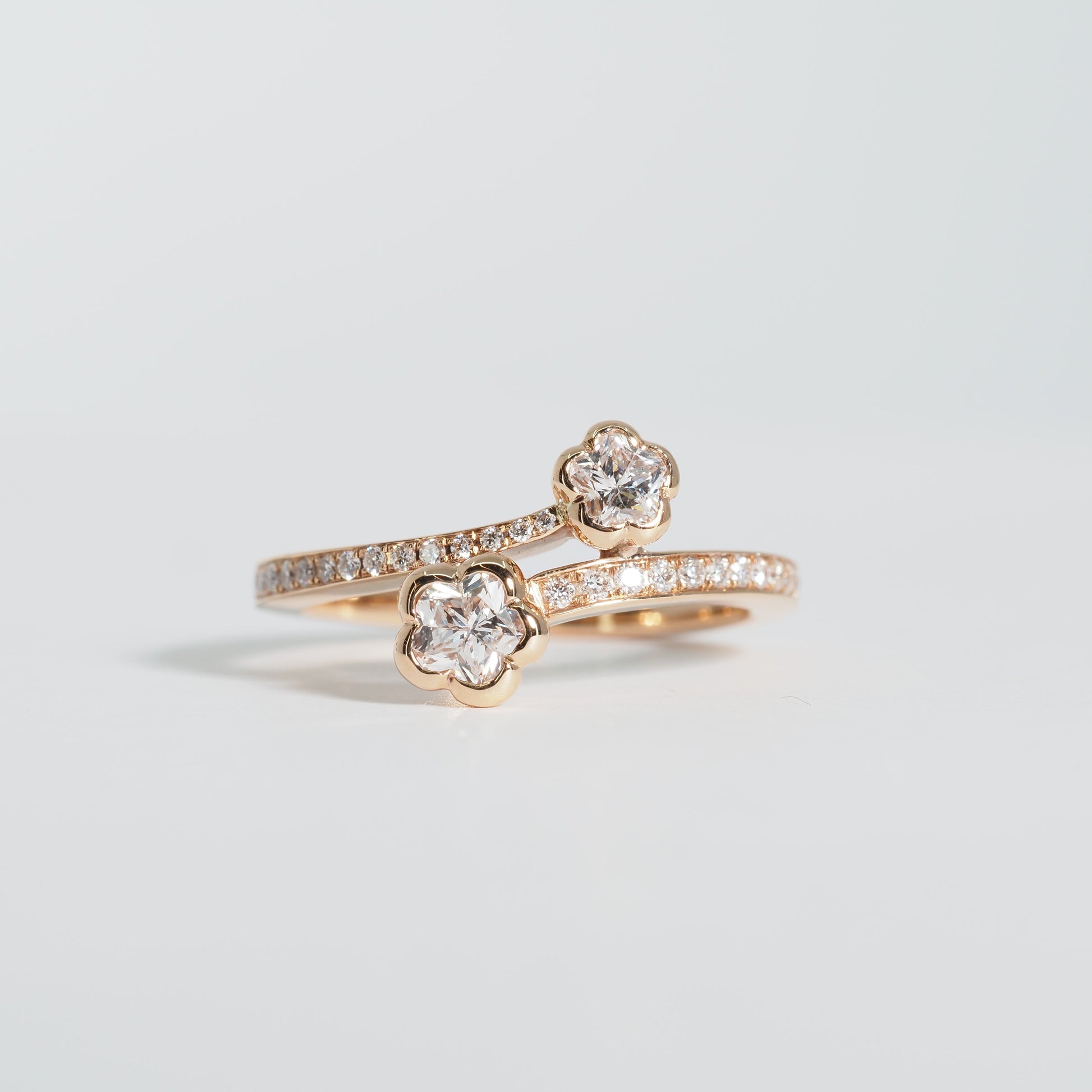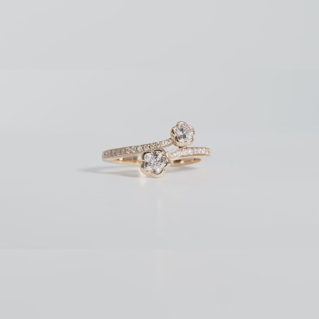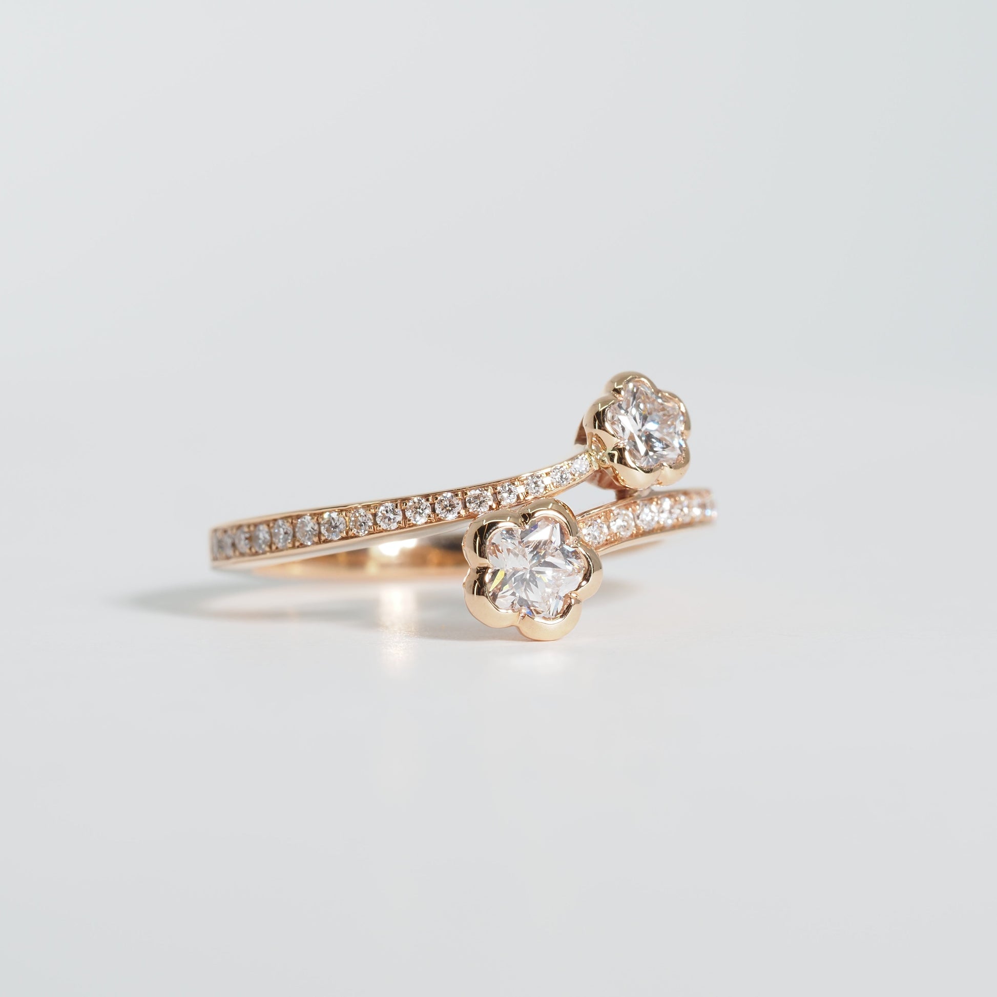 可憐な花をかたどったダイヤモンドが2輪、指元に寄り添うようにセッティングされた、軽やかで洗練されたデザインです。
