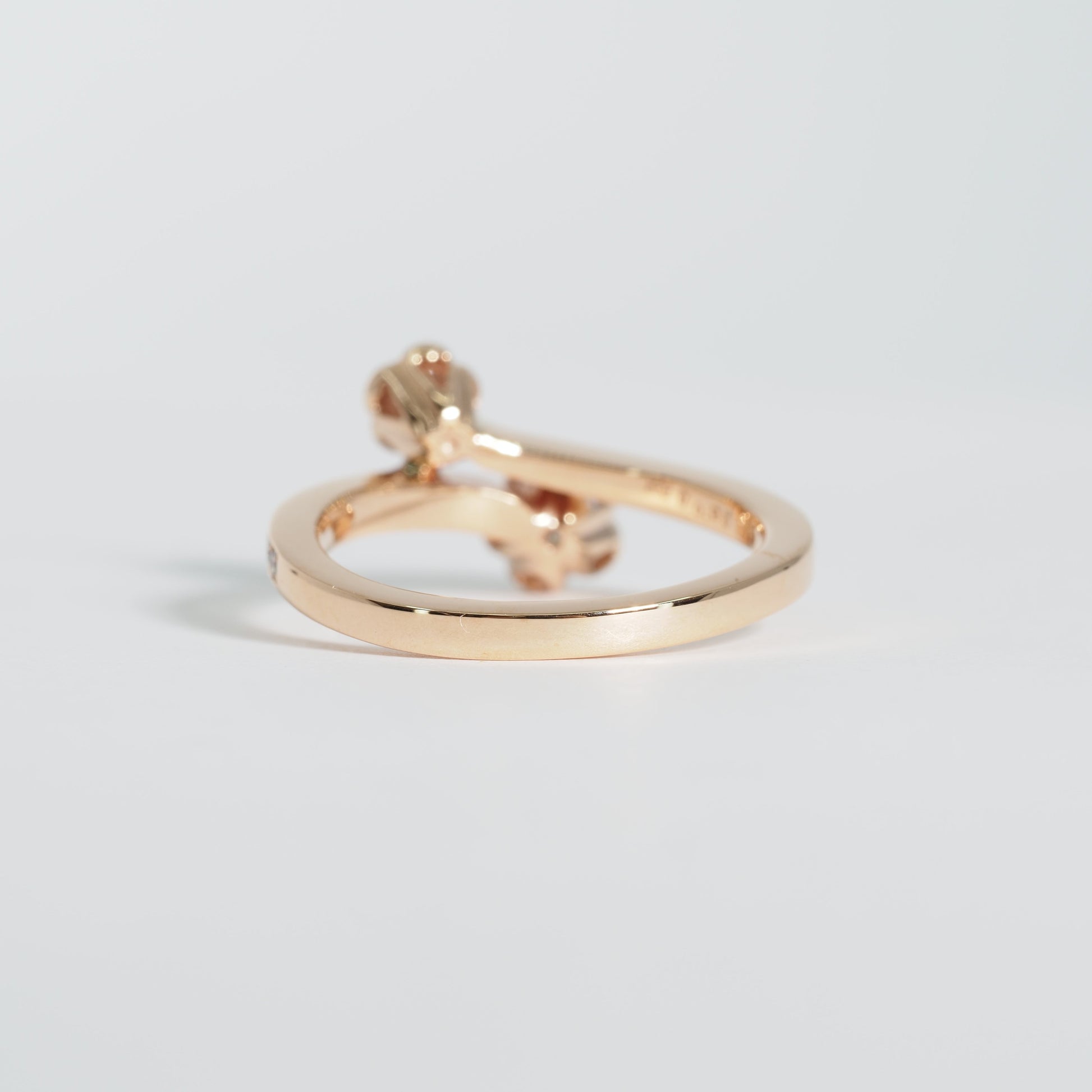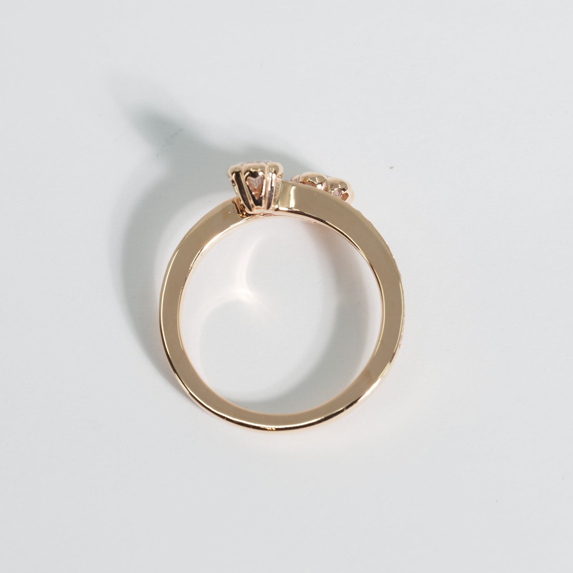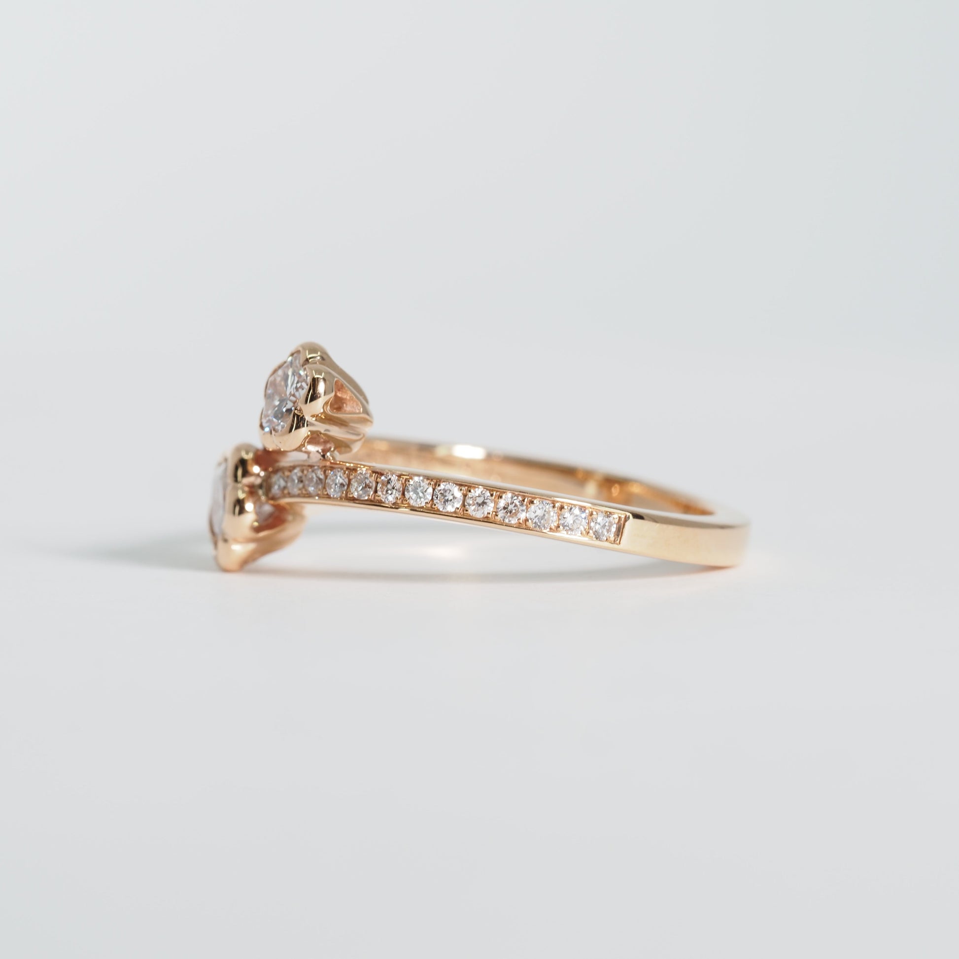 可憐な花をかたどったダイヤモンドが2輪、指元に寄り添うようにセッティングされた、軽やかで洗練されたデザインです。